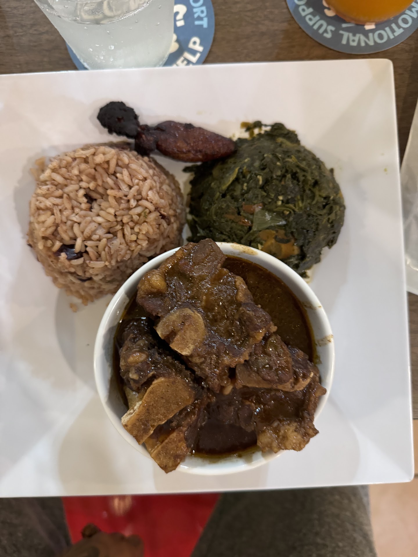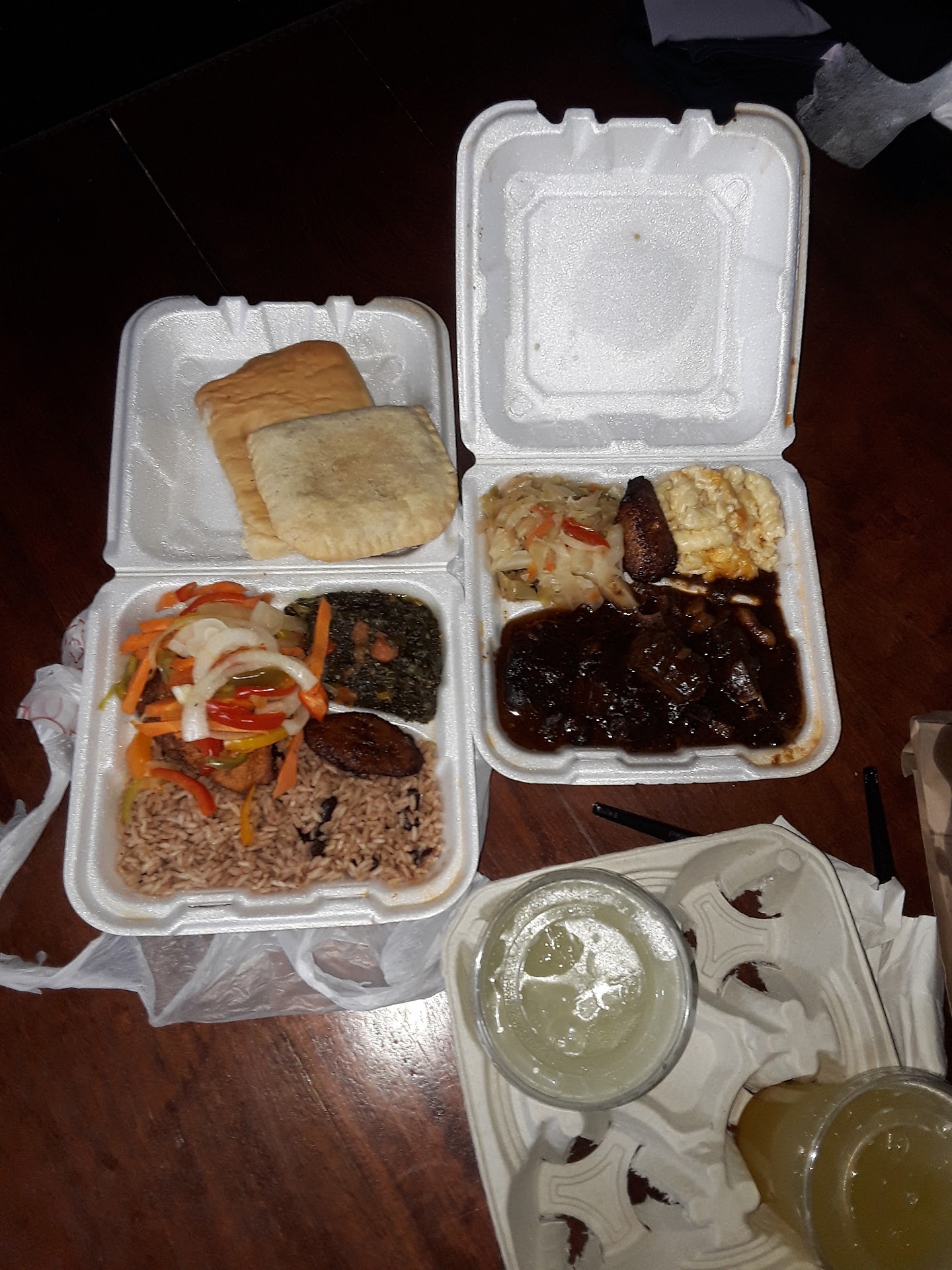 I ordered the brown stew chicken and oxtail with mac and cheese and rice and beans and a side of plantains.
