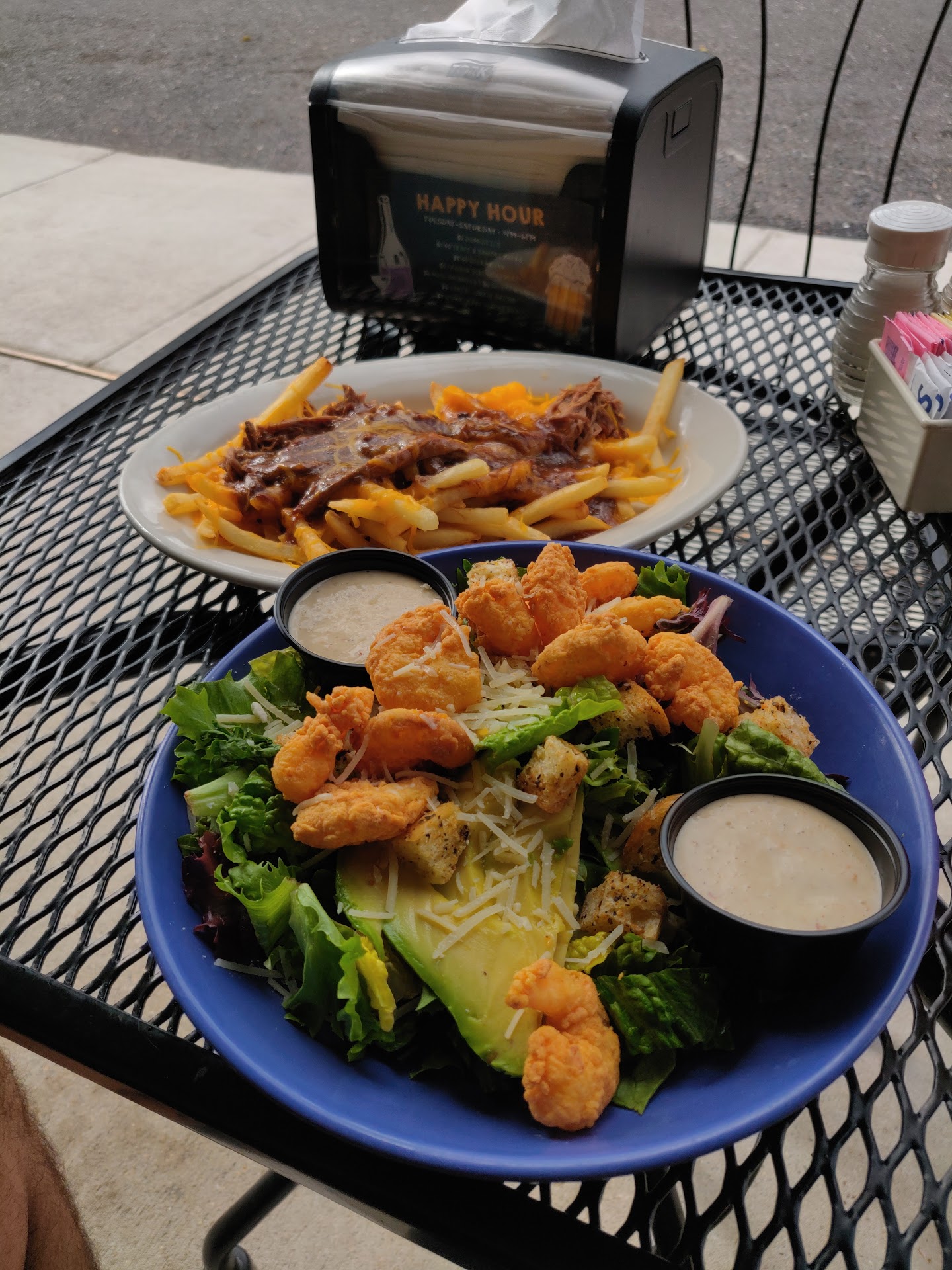 Sat down sweating, The waitress, Celeste? Definitely saw that I needed something to drink and brought a fresh brewed glass of unsweetened iced tea ASAP. I looked over the menu seems pretty good, I went with the avocado and shrimp salad (13.99) and the side of cheese fries with gravy (5.99? Felt fatboy)