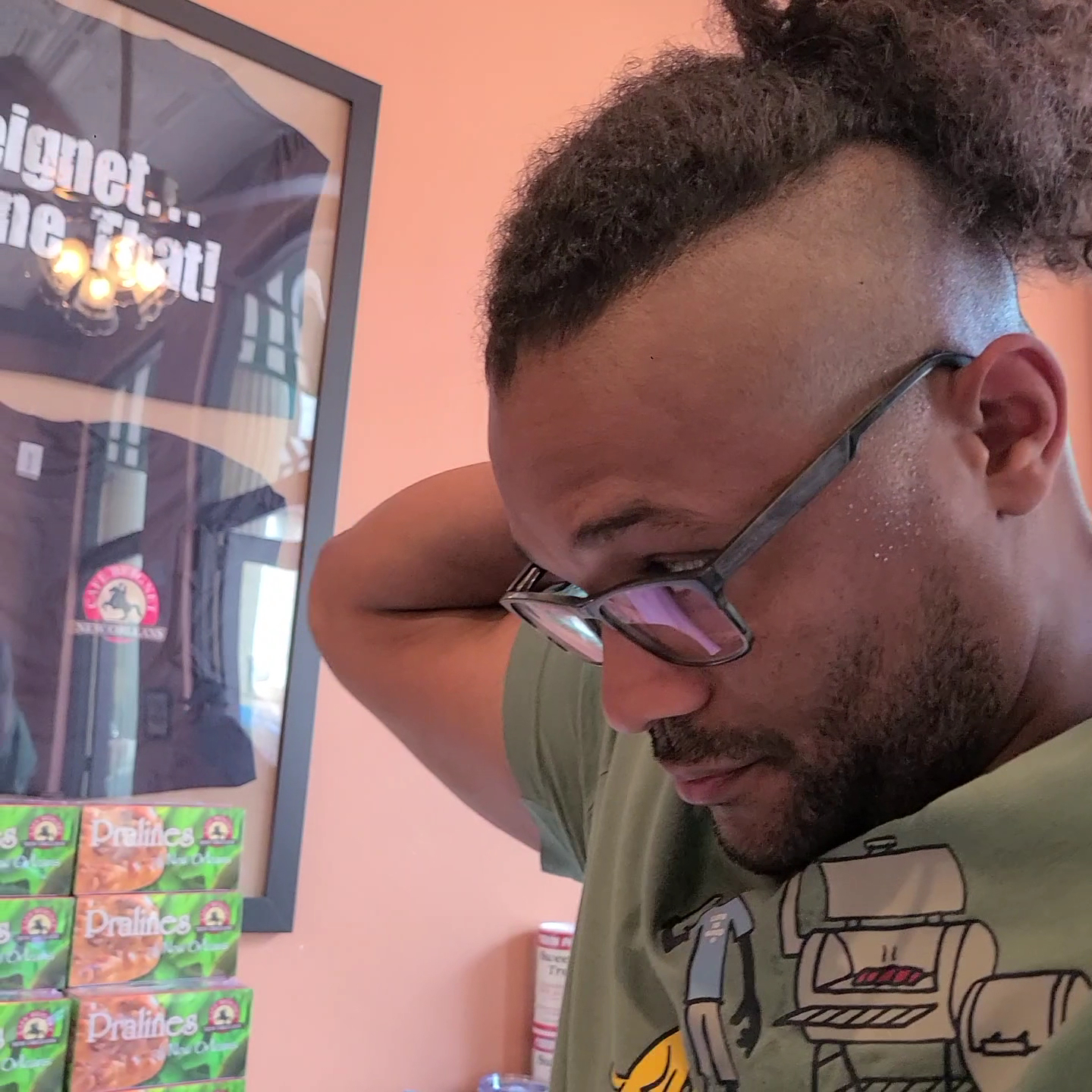 Read moreWe stopped to eat here on our way out of New Orleans. It was our first time visiting, and this place was super cute and had the New Orleans vibe going. A self playing piano with great jazz music filled the room entertaining us guests. The food we ordered was better than expected for a deli/cafe style dining place (you have to stand in a long line and order your food). Most everything they serve with meat is pork or some type of seafood. For people like us who do not eat anything with pork (not keen on seafood), it can be a little frustrating. We tried to request that the pork on an omelet be replaced with the turkey meat they use on their sandwiches, but they were unable to make that accommodation, so that was disappointing. Though they were unwilling or "unable" to accommodate us in that way, the service was good; everyone was nice and polite. The seating was a bit tight and uncomfortable because it was packed and tables were small, so we barely had space for 4 meal orders, to the point the lady who brought our food out made a comment about it, "love it when we run out of room". Their beignets were ok (but this is just a personal preference). They are more on the cakey side, where the dough is more dense, but they do serve them with the chocolate dipping sauce, though we ordered ours to go and our sauce was missing. (Cafe Du Monde's beignets were better, in my opinion, but they don't serve the chocolate dipping sauce.) Cafe Beignets grits were delicious, the best grits I've ever had, they were creamy, fluffy and flavorful. They were so good we took a to-go order! Overall, this place was a great pit stop for brunch, and we did enjoy the...