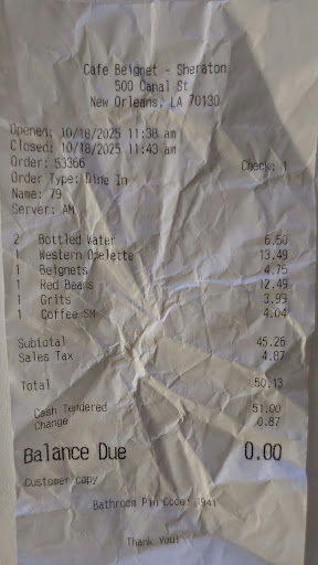 Western Omelette $13.49 Generous serving of eggs with ham, bell pepper, onion, and cheese. Served with grits and French bread. Nicely seasoned and hearty. Red Beans and Rice $12.49 Classic New Orleans flavor creamy, smoky, and satisfying. Grits $3.99 Smooth and buttery, paired well with the omelette. Beignets (3 per order) $4.75 Light, golden, and covered in powdered sugar a must-try indulgence. Small Coffeeâ $4.04 Balanced roast, great aroma, but slightly overpriced. Bottled Water (2)â $6.50