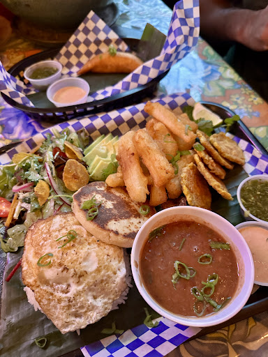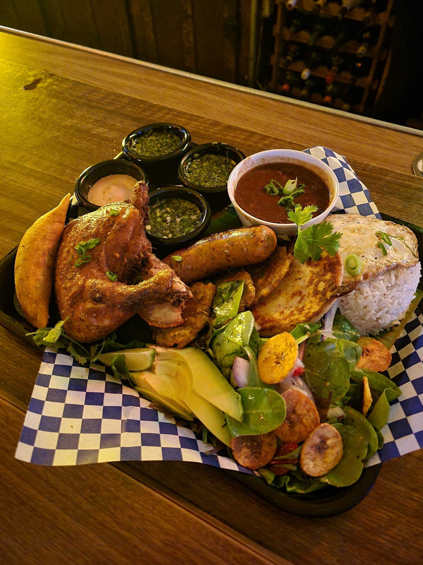 The food here is out of this world good!! Was a little anxious at first seeing the slot machines, trivia night in the bar, and was not prepared for the level of amazing food we had. Vegetarian bandeja is the stuff of dreams: BOTH yucca frita and tostones, as well as the freshest salad in the perfect citrus vinaigrette, arepa doused in butter, perfectly yolky medium fried egg, rice, and beans obviously cooked with lots of love. Steak empanada was also great, make sure you let it cool first. Everything made to order and fresh on a banana leaf, even the empanada. The level of attention to detail and execution is impressive. Not missing out on this place whenever I’m...