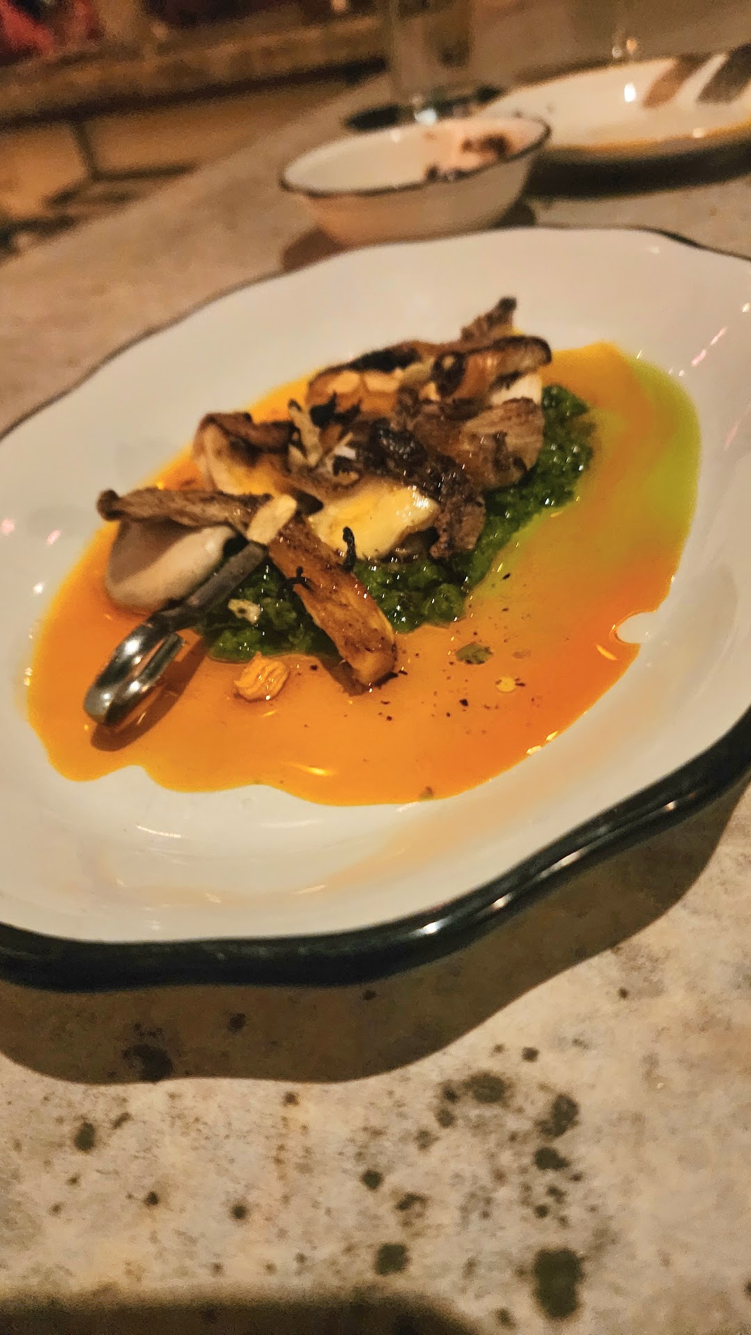 Everything was great, but if I had to choose favorites, I'd say the pork jowls, oyster mushrooms, and the olives and orange peels. The menu has changes daily as the chefs lean in to seasonality and personal interest. Trust the waitstaff and bartenders here to make recommendations as they get to sample the goods before guests do. đ