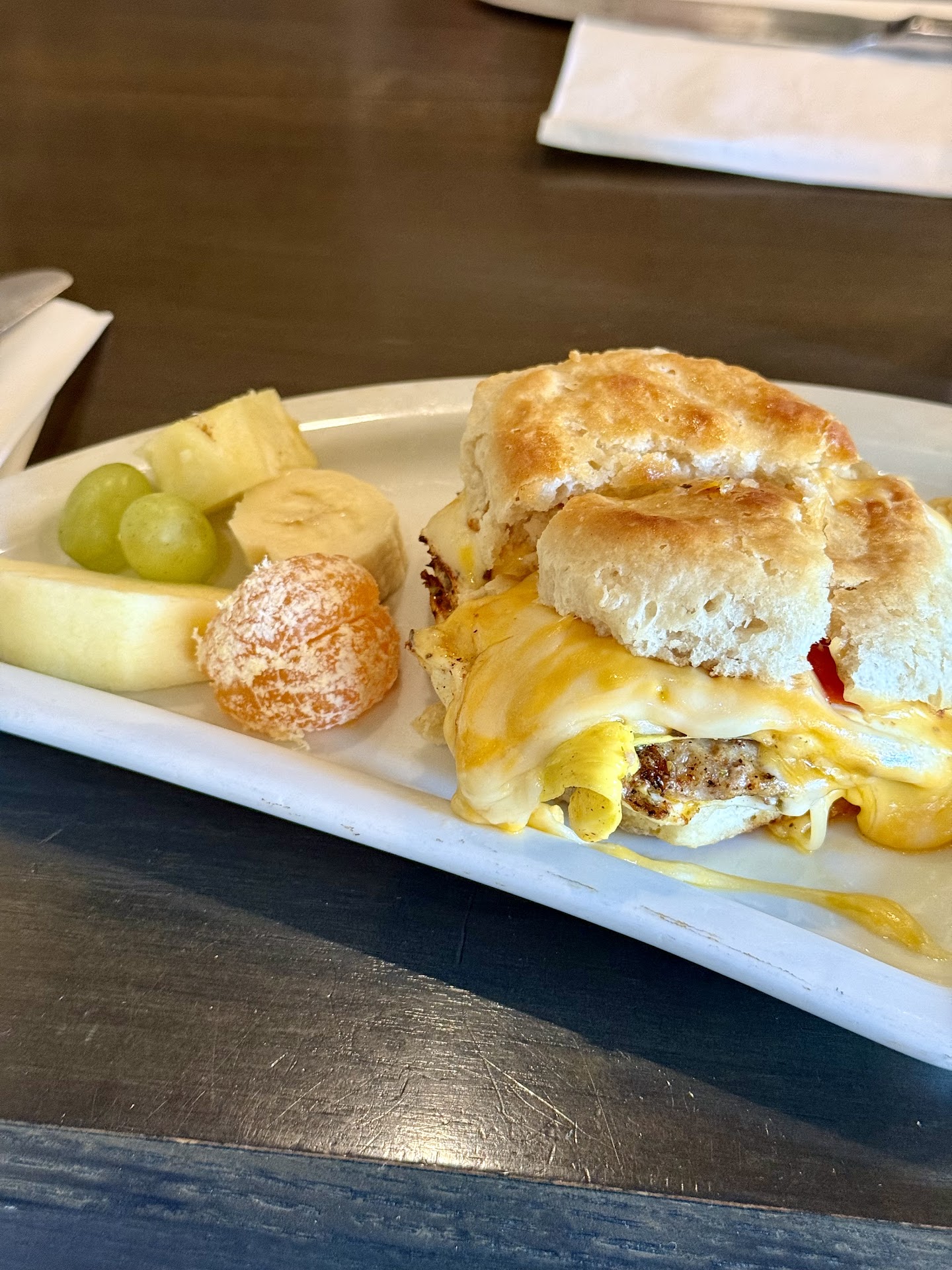 For breakfast, we indulged in a coffee cake, a sausage biscuit sandwich, and a quiche. Each plate was beautifully presented, with the biscuit sandwich even accompanied by a small side of fresh fruit. Every bite was spot on, with incredible flavors from the coffee cake’s sweetness to the savory goodness of the biscuit and quiche.