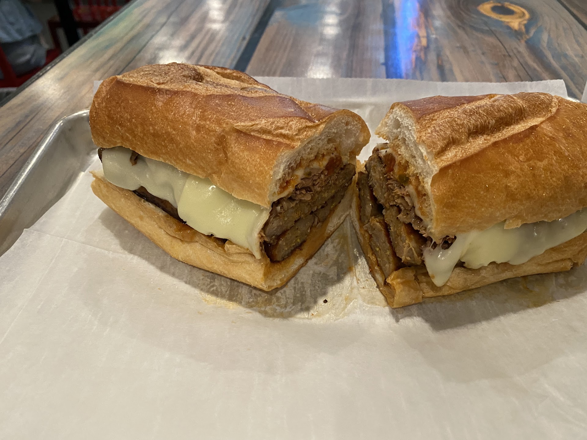 We left hungry and confused:. What arrived at the table.. looked what could best be described as cat food stuffed into the end of a loaf of French bread.