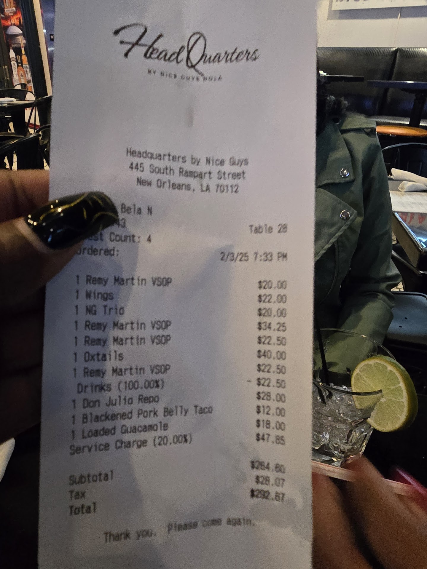Read moreHEAD QUARTERS BY THE NICE GUYS was one of the worse experiences for my first time in New Orleans. It almost ruined my trip but by the grace of God and my Christianity I recentered my energy. I am writing this review to warn others DO NOT GO TO HEAD QUARTERS BY THE NICE GUYS. Our waitress was very nice and management sent her to do their dirty work!!! Super Bowl weekend (Go Eagles) is an experience of it’s on let alone being in New Orleans. We wanted to enjoy the game. We were told that after dining we had two options to pay $75 per person with a reserved table or pay $50 per person and go upstairs with first come first serve seating and both options let you enjoy the game on the television while you still order from their menus. We (3 adults) decided on the $75 per person . We were told that our regular time limit was up on our table and we would have to come back at 4:30pm for our reserved table. We had already spent $150+ for our first visit for drinks. We arrived back at 4:30pm we stood in very long line about 30/40 minutes later our name was called. We were seated and very excited! We started our order for drinks, enjoyed the first quarter of the game and ordered food. Around the second quarter the waitress asked if we were okay and needed anything else we stated no. She then said that you guys time is almost up and we would have to leave. We all looked puzzled and confused. We then stated no we’re doing the $75 fee a person to watch the game. She then Stated “oh management isn’t doing that anymore they are allowing people to watch half of the game other people are waiting and management is trying to accommodate everyone”. We were not told of any changes prior to being seated for our second visit or prior to ordering from the menus. WAIT WHAT IS GOING ON!! The game is on now, where are we suppose to go? More than upsetting news! We then asked if seating was still available upstairs; she then proceeded to go check. The waitress came and proceeded to say the price for upstairs seating that was $50 is now $100 and there were no seats. So we asked what else could we do to keep our table we already had. The waitress then went to speak with management again, she came back and said our bill would have to be $600-$1000 dollars in order to keep our same table! WHAT!!! We could purchase a $400 bottle of alcohol of our choice. We decided not to support Head Quarters by Nice Guys any further because they obviously do NOT care about their customers. If I were you I would not support anything to do with the Head Quarters by Nice Guys everything was over priced, food was not good, they charge a 20% gratuity (which is NOT the waitresses tip) a surcharge of $5 a person, plus a tip. With so many other options to eat/ drink and have fun choose standing on street corner rather than giving your hard earned time and money to Head QUARTERS BY THE NICE GUYS. -0 stars. Why support a business that does not care about...