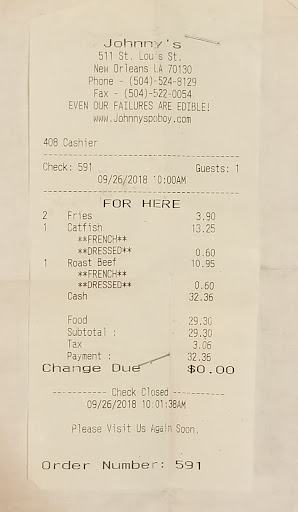 Read moreWell, after a highly anticipated opportunity to finally try a Po-Boy from this place I was less than enthused. I work in hospitality and have sent countless numbers of my hotel guests to this place for a Po-Boy. Why not? I've heard so many good things about this place. A coworker just had food delivered so I seized the opportunity. Before I say one word, most businesses give the hospitality industry a discount because we send them business. I didn't ask for one because that's just not me. If it was to be offered. Sure. I was starving and just wanted a good sandwich. What caused me to write this review? Well. When the delivery guy made it to the hotel I was happy. He was quick and I was starving! When I asked him how much we owed, his response was $32.50. Wow! 2 Sandwiches, 2 fries. Wow! With a $5.00 tip... nearly $40.00 for 2 sandwiches? At lunch time? The reason why I was astonished is because the menu that's listed online reflected prices that were different from what we were charged. So, this ticked us off. We work for tips. We are both over tippers. Yet they chose to rip us off? Serious??? Upcharged both sandwiches, the fries and charged us extras. Refer to the pics in the review. Serious??? For this reason, I will never eat there again. Nor, will I refer any of my guests. The fries were great! The Roast beef and gravy Po-boy. Naaahhhh! It was very bland with no flavor. Roast beef is a salty meat. How could it taste bland. Gravy??? Pot roast juice is more like it. I would not have taken the time to write this review if they had not ripped us off. We are located just a few blocks away and send all of our guests there who inquire about a Po-Boy. Not anymore. In fact, I will deter anyone from going there who asks me for advise. I won't bad mouth. Because I don't do that. Please be assured that I will no longer refer anyone to this place. One and done. Sorry. And I'm no scrub. I've eaten at the finest! Dorris Metropolitan is my favorite place for an exquisite experience and a steak that's matched by no other. Google it and you'll get it!...