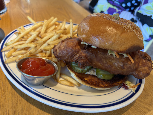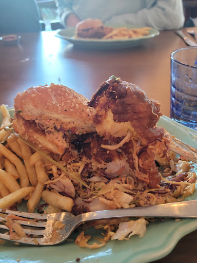 Our disappointment continued when three of us ordered fried chicken and I opted for the fried grouper. My son's first bite into his fried chicken revealed a raw and tough interior, prompting us to send it back. The replacement was better, but my own fried grouper sandwich presented a similar problem. The inside separated from the burnt fry, and the inside was raw. Despite my ruined appetite, I chose not to send it back.