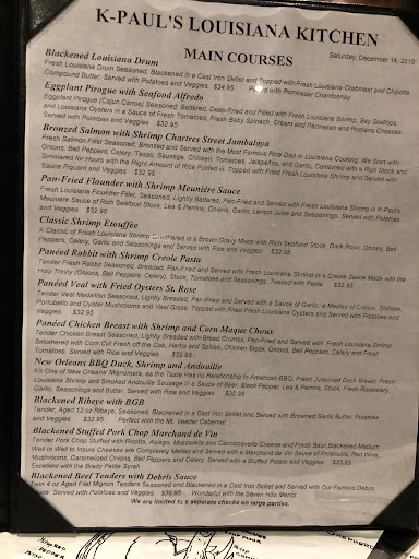 I have been waiting to eat at K-Paul's for decades now, and I have to tell you the experience was absolutely wonderful! My wife and I wanted to end our last night in New Orleans with a good meal, and K-Paul's did not disappoint. First, the ambiance of the restaurant is old-world charming, and the service was excellent! Our waiter's name was Cameron, and he was attentive without being overbearing, while also providing my wife and I with excellent service.