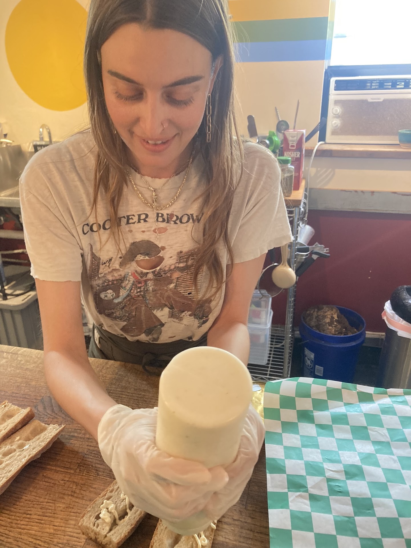 (Attached is a photo of Mik who is also a great writer putting the perfect amount of aioli on...