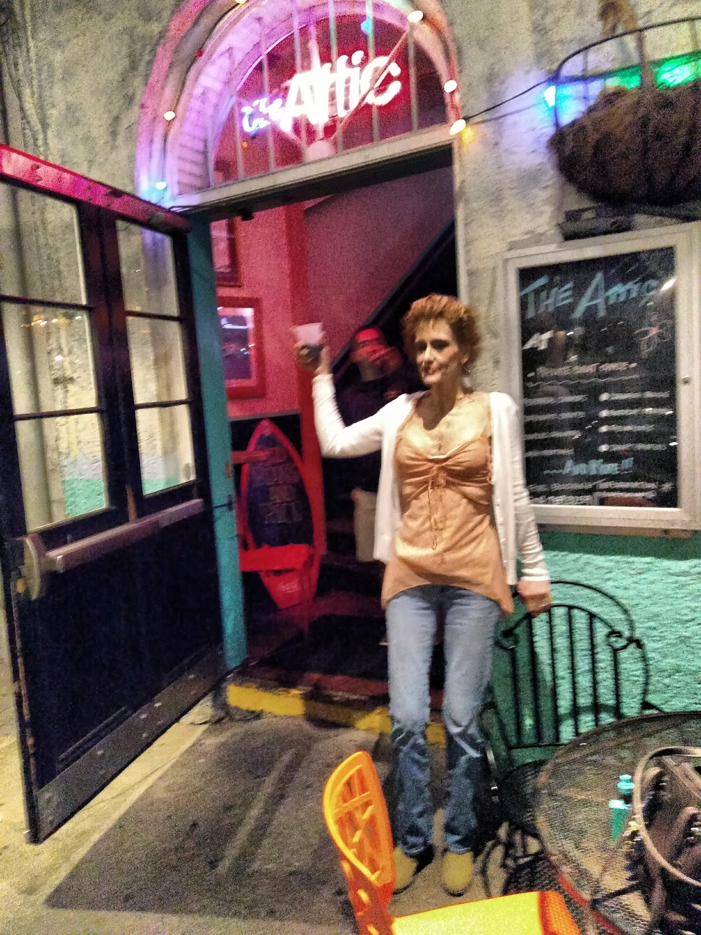 I really enjoyed the atmosphere when we visited Lucy's last Friday night. It was around 11:00 pm when we arrived. The place was jumping! Very upbeat . DJ was amazing. We were starving so we ordered from their late night menu. I had the best nachos ever, with black beans , sour cream, guacamole and lots of cheese. Pico de gaillo on the side. They had everything layered with cheese. Not just piled on the top. I ordered a glass of their house red wine. It was rather pricey for house wine, but really good. The music was loud but good so that you couldn't help but get into it. We watched the late night crowd arriving... Everyone was dressed well and you could tell it was sort of a hipster hot spot, which I was totally enjoying the energy and had a great time. I'll definitely go back again, but til then ..so many places I have to check out, so little time!! I'm loving living in the Big Easy!!! Got a few photos. The side of Lucy's says the attic but the corner sign says Lucy's (Retired survers club!)