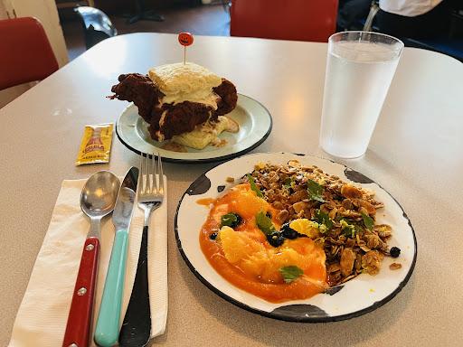 Read moreAnother place I'm quickly becoming obsessed with and I'm not the only one. This was my 1st time dining in after previously ordering delivery. If you can't get here before 9am on the weekend, be prepared to wait. They are that good. The 1st order was the breakfast sandwich, which was gigantic but I didn't get a chance to try. I was too busy inhaling the biscuits and gravy with a fried egg that was phenomenal. Life changing perhaps, cause sausage gravy has no business tasting that good! I want to do unspeakable things with this gravy, just saying. This go around they got the crispy rice salad and I ended up with biscuits n gravy again. I wanted the special vegan tamales, but they were out. I was extra sad about that after tasting the crispy rice salad. Again outlandishly delicious, I thought I was at Budsi's for a minute. It was very reminiscent of Malaysian tea salad, lots of bold flavors and textures that come together magnificently. I didn't understand the sour cream until I had a bite with a jalapeno in it, more yum. My biscuit and gravy was excellent again, and I ended up with leftover gravy. The server almost lost a finger trying to clear my dish. I had planned to order another biscuit, but then I saw the sign for Khachapuri and duh. Completely out of left field, and knocked it out of the park. Rich buttery crispy crust that held more rich buttery cheesy artichoke and spinachy eggy goodness ah my lawd just talking about it. Way too much after everything else, it was a drunken treat later that night. This place can do no wrong, I hope it stays that way forever. It's order at the counter and seat yourself. I do hope they find a better home for the water and flatware station. Decor is eclectic, I had that California raisins lunch box too! There is a decent amount of seating but by their 1st hour of service it was filled up. I've made a previous solo attempt and kept moving because the line was down the block. Also Uber eats stole my last delivery, this...