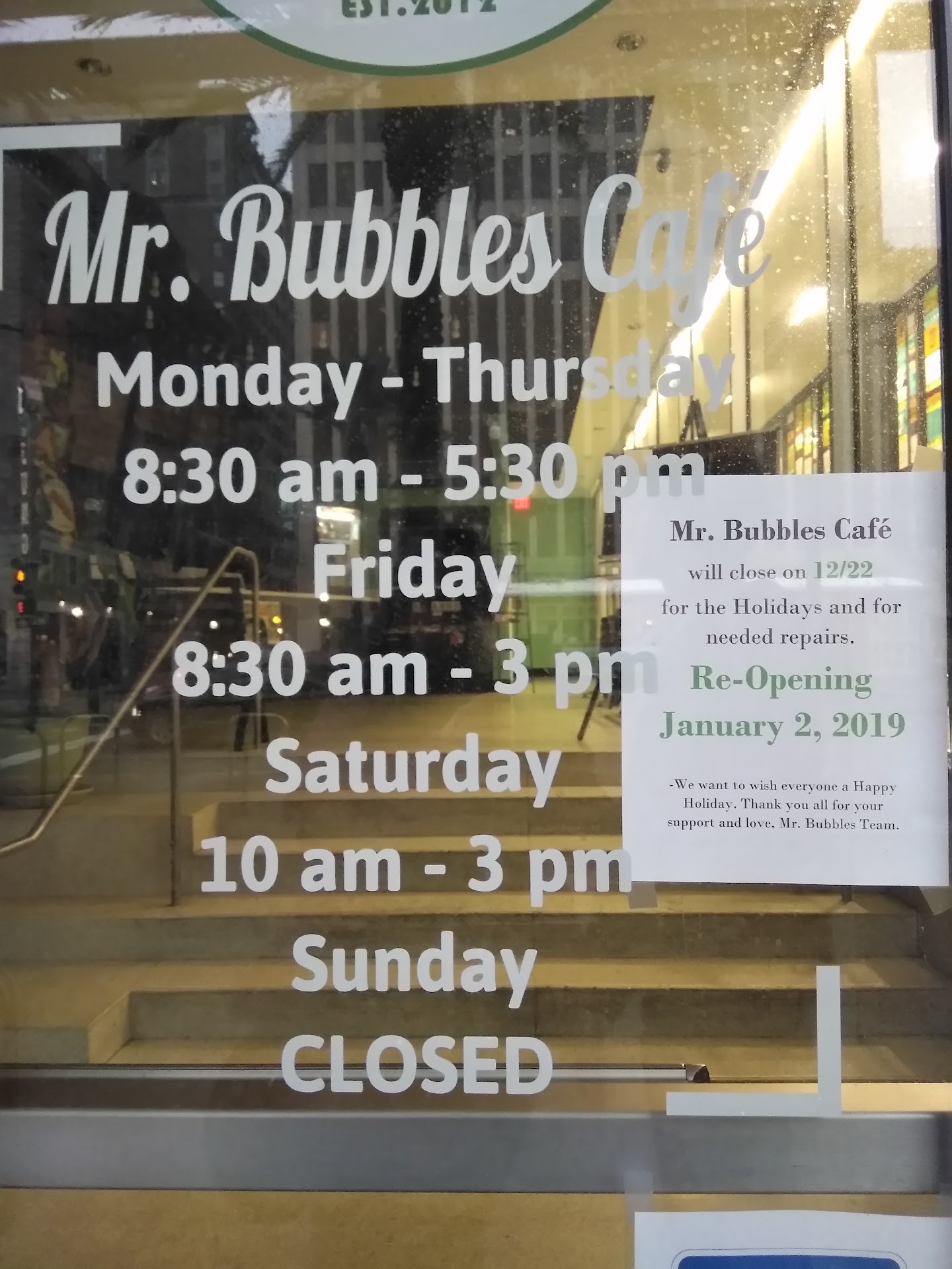 So here is a picture of the door sign with normal operating hours (I hope) as well as apparent closure dates. Mr Bubbles: please update your Google site or place something front and center on...