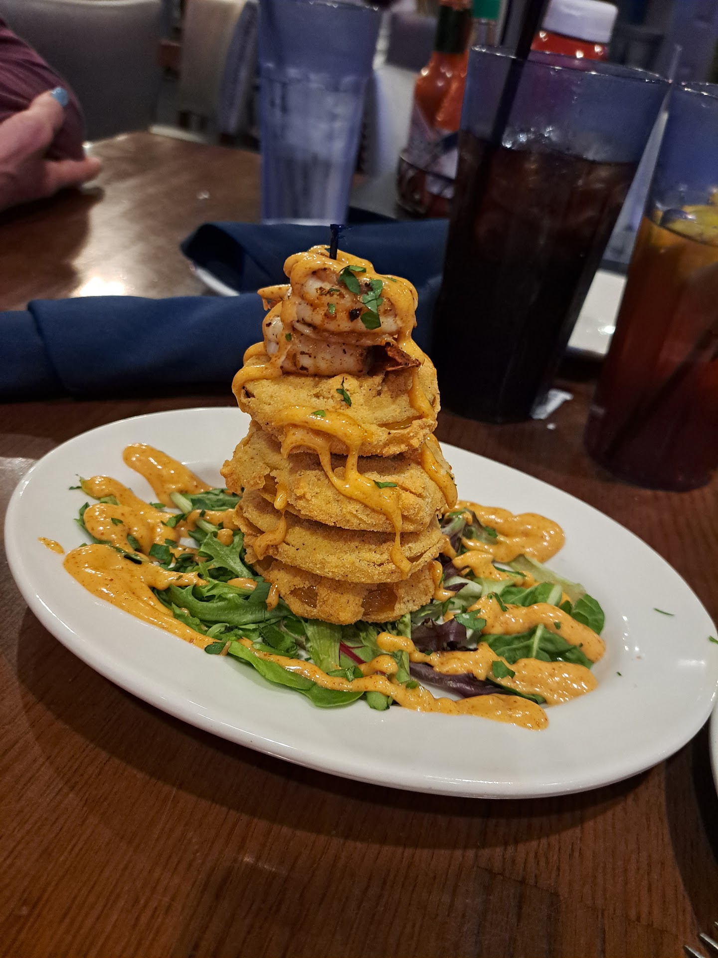 The tomatoes came out and they were great, although you only get 4 tomatoes and 2 small pieces of shrimp. We waited over 40 minutes for the rest of our food. My husband's food was completely wrong. He was supposed the get fried chi ken, catfish, shrimp, and jambalaya. We didn't get half the items included in the meal, just a plate with Fried chicken. The server said "well, I can ring in a side of jambalaya"....that was already supposed to be with the meal! He waited over 20 minutes for the right meal.
