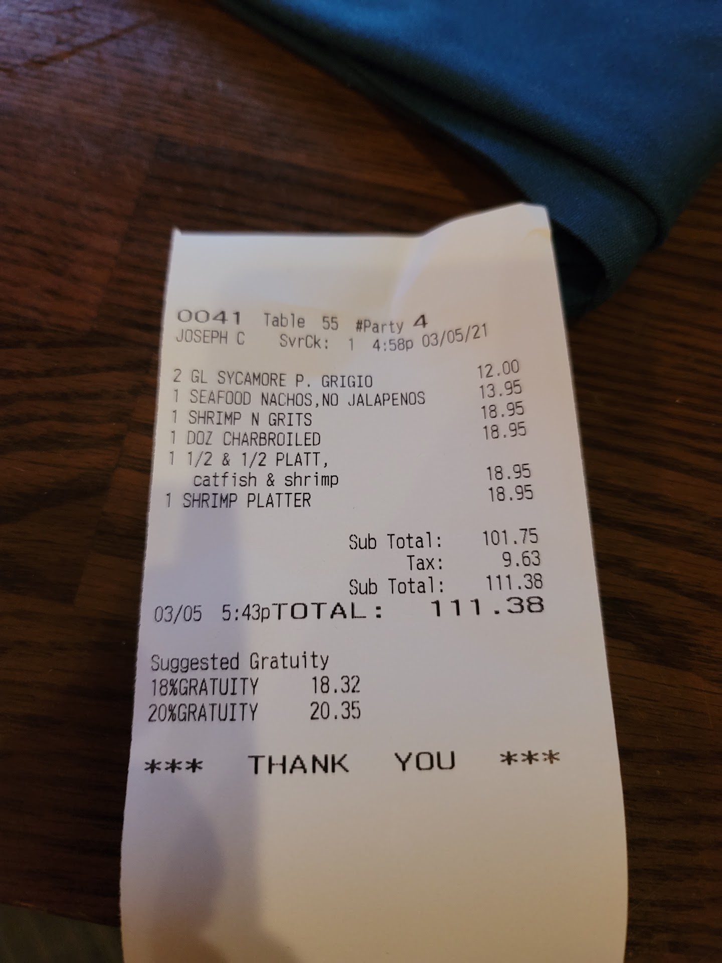 We didn't short Joseph on his tip, even though he should have been the one to run interference for us with the manager to make it right. That didn't happen to our knowledge and no discount was provided. The bill is included for your perusal.