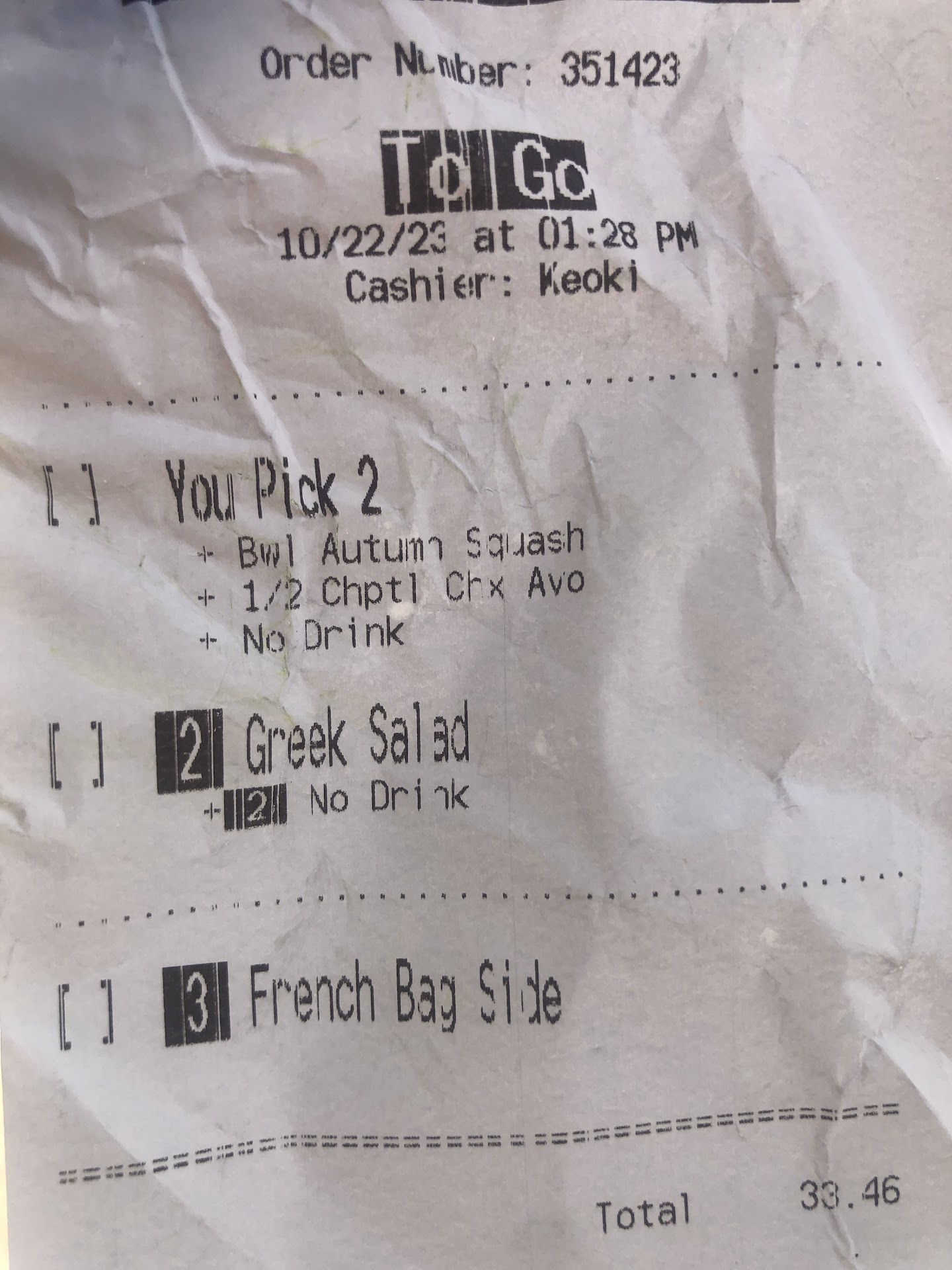 The quality of the food has also decreased, there were a couple bad pieces of fruit in my fruit cup and some lettuce was wilted in my salad. I only got a 1 ounce container of dressing with my salad which left most of it bare making it more obvious it wasn't fresh.