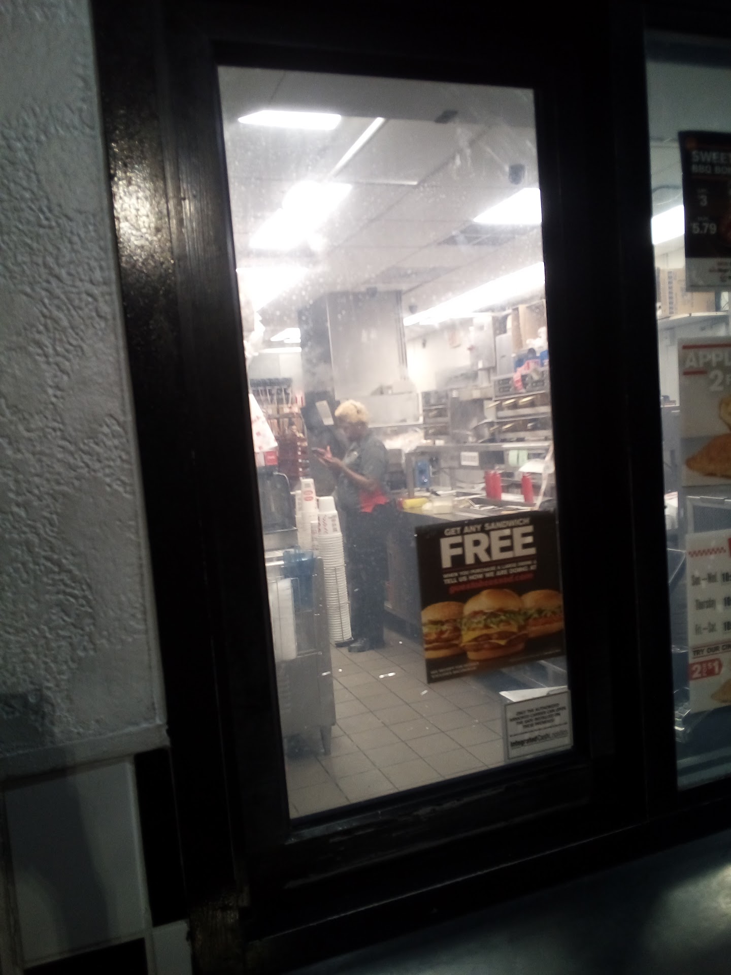 Read moreI live about 2 blocks away from this establishment and I thought âoh, theyâre open at the moment. Iâll go here because itâs so late (1:45am). I waited almost 15mins for someone to come to the window and almost 20mins to receive my order (a sandwich and fries). When she initially opened the walk up window, there was a pungent smell. I shouldâve ran to my car then. After I paid, I asked the manger if she could put ketchup in the bag and she said they were out. I asked if she could put a bbq sauce in the bag and she tried charging me lol. Like, how could you charge someone for an improvisation when you guys ran out of something? She also seemed irritated like I was the reason why she couldnât leave. No sweetie, your schedule is the reason and kindness goes a long way. Wish I could give zero stars. I DO NOT RECOMMEND EATING...