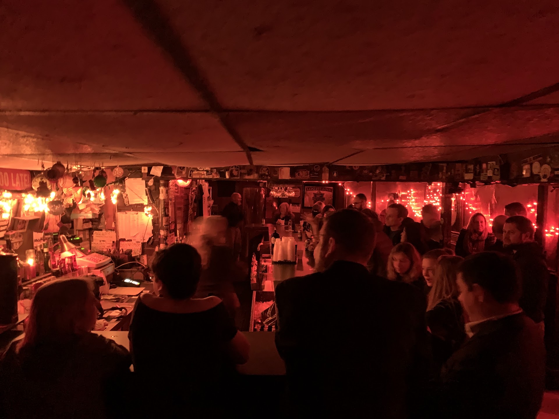 Read moreI think it's a 3.5+ b/c I love quirky. I figured it would be a dive, and essentially, it was, but with so much functional coolness, you've just got to love the experience. Dark, no real parking, and tucked into an uptown neighborhood. But, for all that, you walk in, temporarily blinded by the darkness and then you adjust to the beady, red light strings and you notice there's a bar and some rustic furniture and you flash back to the real glory days of Port of Call b4 its homogenized and pasteurized modern reno. I'm left to wonder if they made burgers, would they be as good? My friend led me thru the bar that, with just a few steps, resembled a shrinking twilight zone hall to hell but once through the plastic flap curtain, opened into a backyard wonderland of giant oaks, string party lights, surrounded by uptown cottages. I loved it and could see myself there in that lovely oasis with any band and any body! This has to be why I've heard so much about this place and the reason I knew I'd be back. But then, later sitting at the rickety table inside the bar, random seeming, folks walked in with trays of food and portable stoves. They tacked up a poster that read, Taco Tuesday, who knew. Then another random guy appeared from nowhere with an accordion, sat down, and began playing. I was transported back to that gondola in Venice. Whatever he played, whoever he was, it was just perfect, random, awesome, odd, unexpected and quirky....