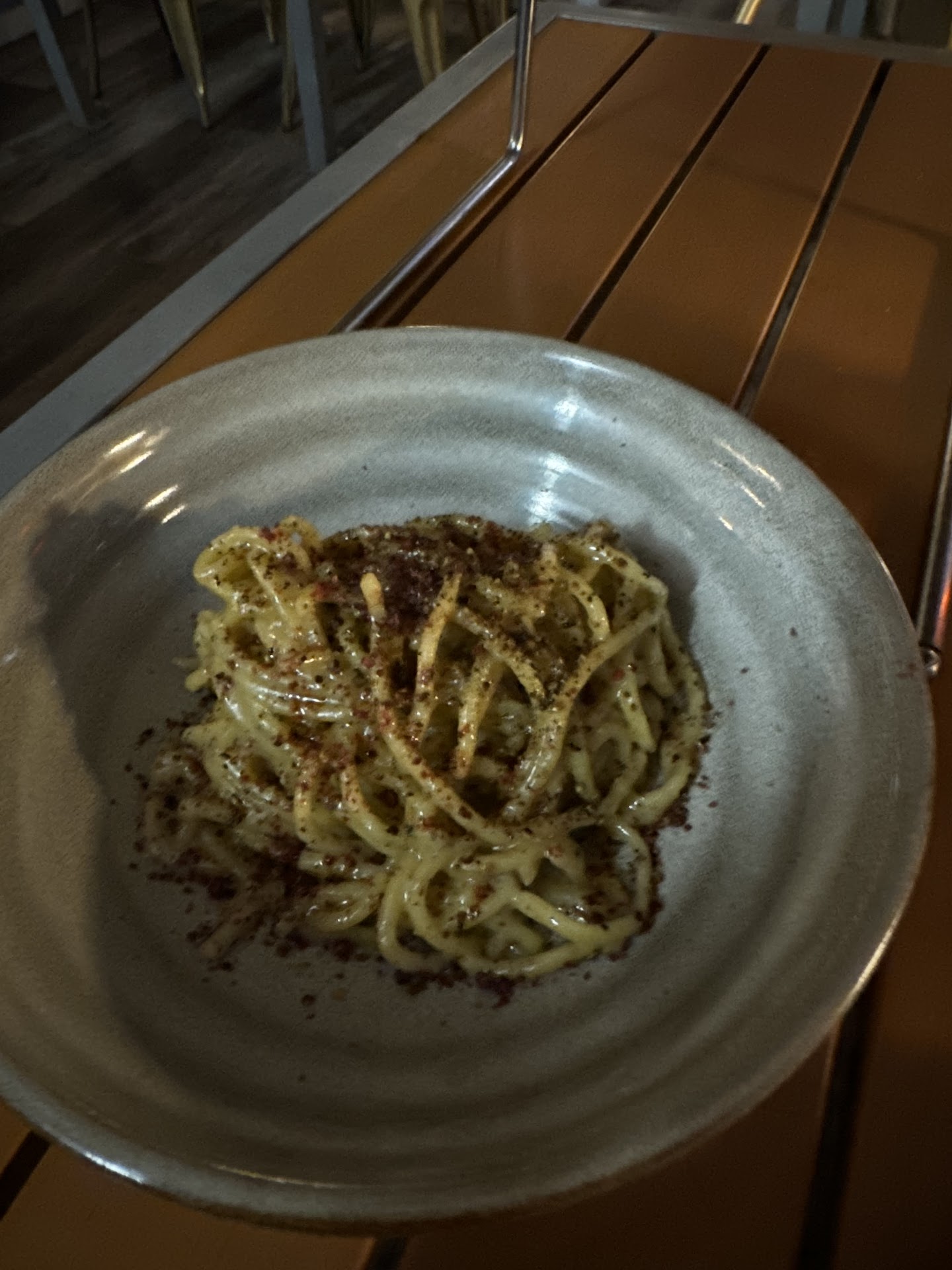 "lets stay a while and enjoy the evening". he said... The food was nice and it was not too loud. lucky! The food came out hot enough, but oddly though the cacio e pepe had a nice taste it had already started to coagulate on the bottom of the bowl. It was also alittle dry. I had asked how to zuccini was prepared and the waiter asked someone and returned... . 'they grill it." Great. we'll have that. But what we got was a cut up zuccini in a sauce of unknown ingredients. kinda of nuts and olives or something.... Not at all the simple grilled vegetable I was expecting. Ok, still, it all tastes pretty good.. Not New York, but good. The pizza had a very nice crust. and the red sauces was simple. I should mention that the pasta with the vodka sauce is very very spicy. 'yes we are from here". 'then it's not too much for you'. the waiter said, with absolutely no attention to the fact that we said it was kind of hot for us. . 'is it too hot for you, shall I remove it?" That was disappointing. we ordered a few dishes to sample, thinking by the look of the place and stars on the internet it was going to be good. Our table behind the hostess station might have been a good seat, out of the large echos of the big room. But it also sat us in back of the bar as well. And there is a washing machine back there that is very, very loud and it creates a low tone, a loud low buzzing. 'is that some kind of breaking speaker? What's that sound?" No. It was the dishwasher. He ran it once then he ran it two more times. So I guess they installed a mini-dishwasher for the bar glasses instead of washing them in the sink. At that point, when they ran it a second time, we said "well, this meal is over. " Very disappointed.