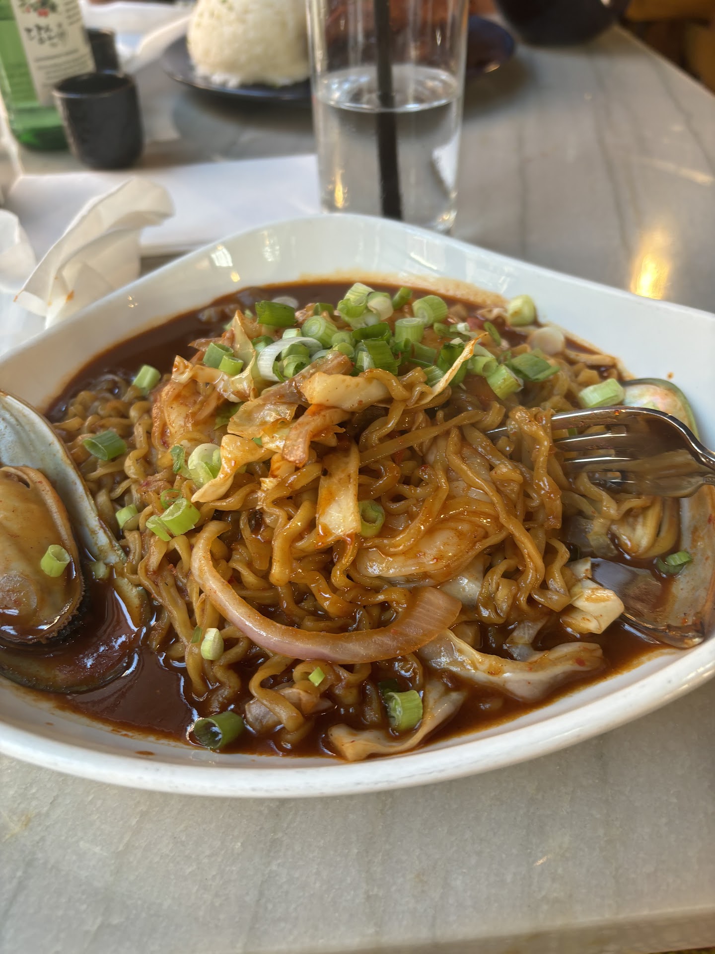 On a relaxing afternoon and beautiful day nothing is better than going out for a bite to eat . Well we decided to try Sun Chong we made a reservation for 4:30 we were on time and seating was a breeze we got sat right next to a window I usually donāt like window views that lead to watching people go by but it was ok , As we were looking at the menus and talking I noticed time was going by and no one acknowledged us I saw server talking and laughing with each other but not doing things with the guess so it wasnāt busy , I also noticed a photographer taking pictures of drinks with a young lady who was dress as Mr. Monopoly didnāt understand why they choose to do Advertising pictures in the restaurant while people were in there but anyway after 15 mins of waiting we decided to stop a server and ask could she get us our server the young lady took the initiative to ask us if we wanted water or something to drink and she would find our server . I canāt remember the young ladies name but she was helpful she took our drink and appetizer order. 10 mins later after this our server came over and asked about our drink and appetizer order and we replied another young lady helped us already , so she left to get the strawberry Soju bottle said she would be right back to take our order the server took our finally and went to the next table . 20 mins later we received our order of Sun Chong wings the appetizer wings were hard and dry to the bone the sauce was Mediocre and a taste was bland.The server didnāt deliver the wings it was a guy with a lot of Tattoos I donāt know his job description but he brought them to the table 10 mins later the server came to see if they were ok I replied I guess itās because I had one and I was done my son ate them . The sever later brought out the entrees I had the seafood Ramen and he had the Yum yum fried ribs , My son kept his Ribs even though much like the chicken they were dried out and sauce added to them the food was Atrocious. I took one bite of the Ramen and I couldnāt it had spice but no flavor I mentioned it to the server and she asked it I wanted something else I replied let me see the menu and I opted on having nothing .This is a Restaurant that I will never visit again. The service was terrible as well as the food . The tip is included and thatās really not good especially if youāre not making sure the servers are working for them Tips = (To insure prompt service ) Iām definitely disappointed in this...