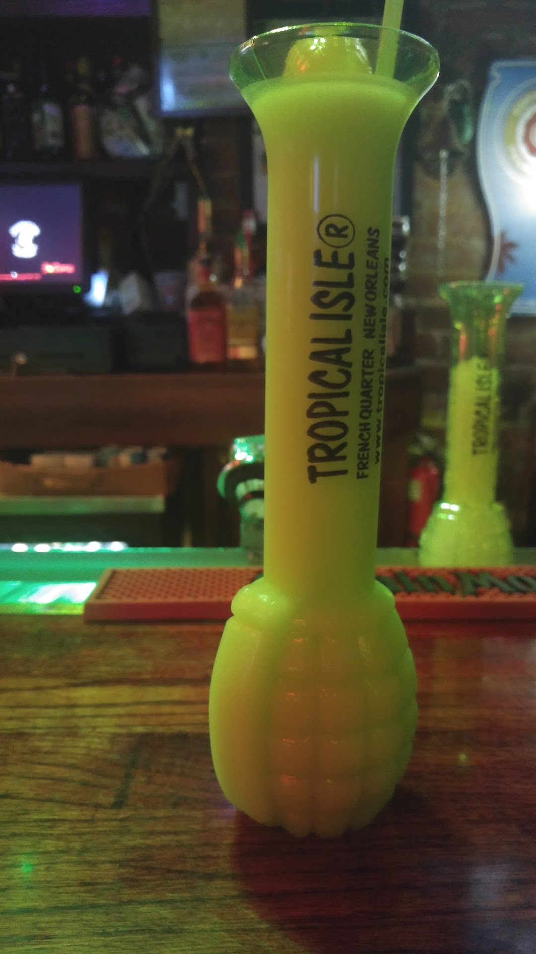 There were plenty of drinks to pick from, but hey we're on Bourbon Street so it only makes sense to get the strongest drink they had. With that said, we opted for the Hand Grenade! Only other decision to make was frozen or on the rocks?! Frozen of course. Why get the strongest drink available to load it with frozen chunks water only to realize it's ruined as the ice melts (ok ok I'm a sipper). At first sip, I fell in love with the tropical fruity flavor of the drink, I also immediately was made aware that alcohol was present . Not overbearing, but not lacking. We scurry out to catch our cowboys and get to work! I had drank half of my drink before I knew it, so me being me decided to google it. After all we should be aware of what we're putting into our bodies (after-the-fact May be a little counterproductive, but let up a little, I was overcome by excitement). So with my drink between my knees I Googled "what's in the hand grenade from Tropical Isle", Drumroll please.........190 proof grain alcohol and a tropical blend word to the light weights, hang with people you know and trust and can have pure fun with. 20-30 minutes later I felt like I had taken 3-4 shots and was comfortably tipsy. Note, I still had the Grenade portion of the drink left. It was a family vacation so I sat it on the dresser and went about my day. Feeling great might I add. It is important to note that the next evening I decided to finish my drink, it was still as strong as the moment I purchased it, full flavored, not watered down at all AND I got the same buzz. what if I had drank the entire drink the day before? Talk about drunk potential .