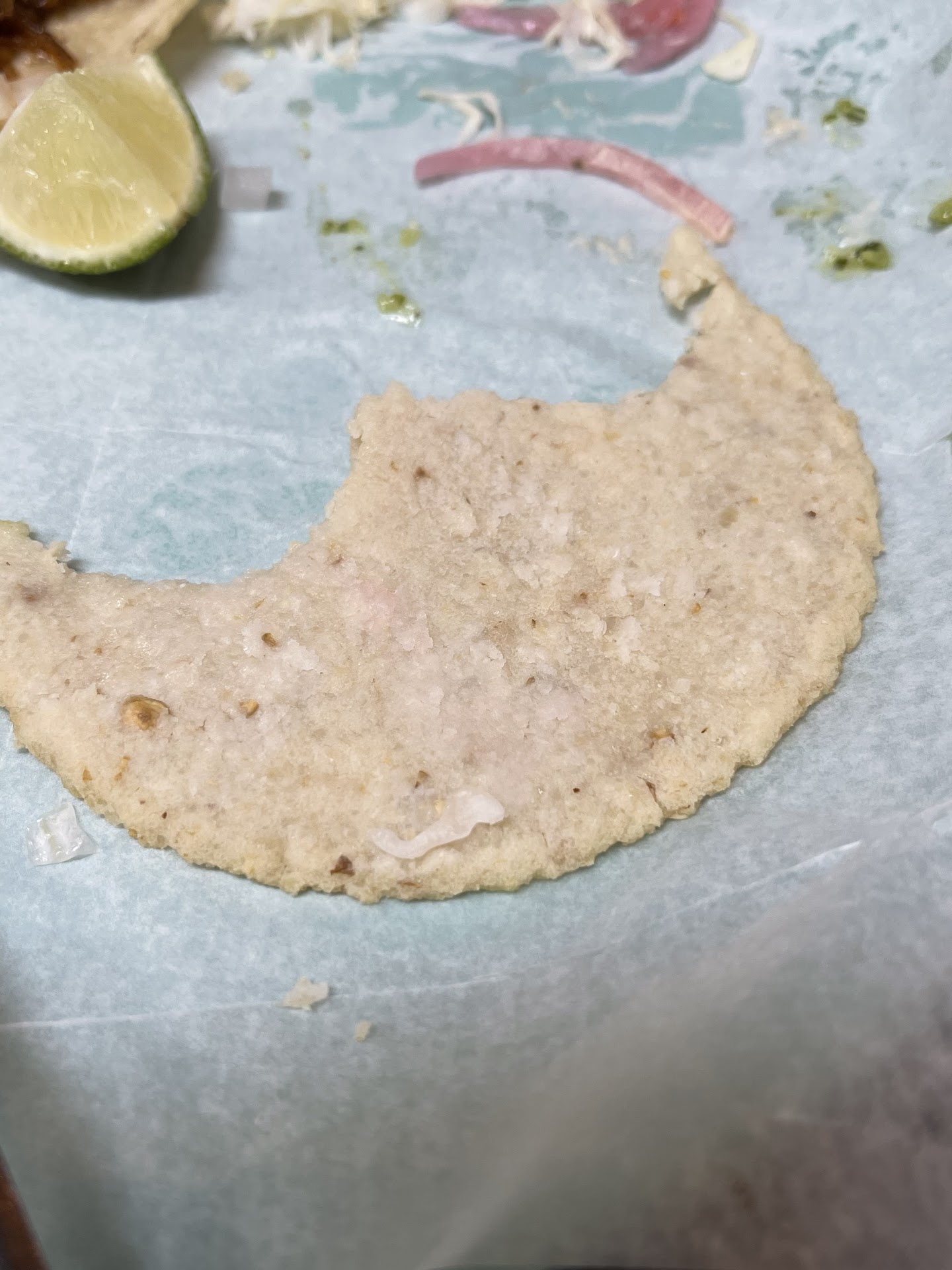 Read moreI was very excited to try this place out and I was more than disappointed. My boyfriend and I shared the beef, pork, and fish tacos. The fish and pork were decent, but the beef had 0 flavor, like it tasted like nothing, not even beef. But that wasn’t even the big issue. After taking a couple bites, I realized the tortilla has the WORST texture, like old peeling rubber. Upon inspection, I realized the tortillas were horribly soggy. Like it looked like wet dead foot skin when you get a pedicure and they scrape your dead skin off. It was that bad. I wasn’t ready to give up tho, so I asked the waitress for new tortillas because they were soggy (I made sure to say they were soggy so they could made sure they new ones weren’t soggy) well, we get the new ones and they’re the EXACT same, like they had just been run through a dishwasher. She came back and asked if they were better and I said, no not really but it’s fine we’ll just get our stuff to go. She just said okay and brought us our ticket. That was that, I was ready to pay and leave… UNTIL I saw the bill and they had the AUDACITY to charge us extra for the “extra” tortillas. That’s the main reason I was motivated to write this review, to warn others not only of their nasty tortillas, but also their extremely poor customer service. I have provided photos below. So imagine that, but WET...