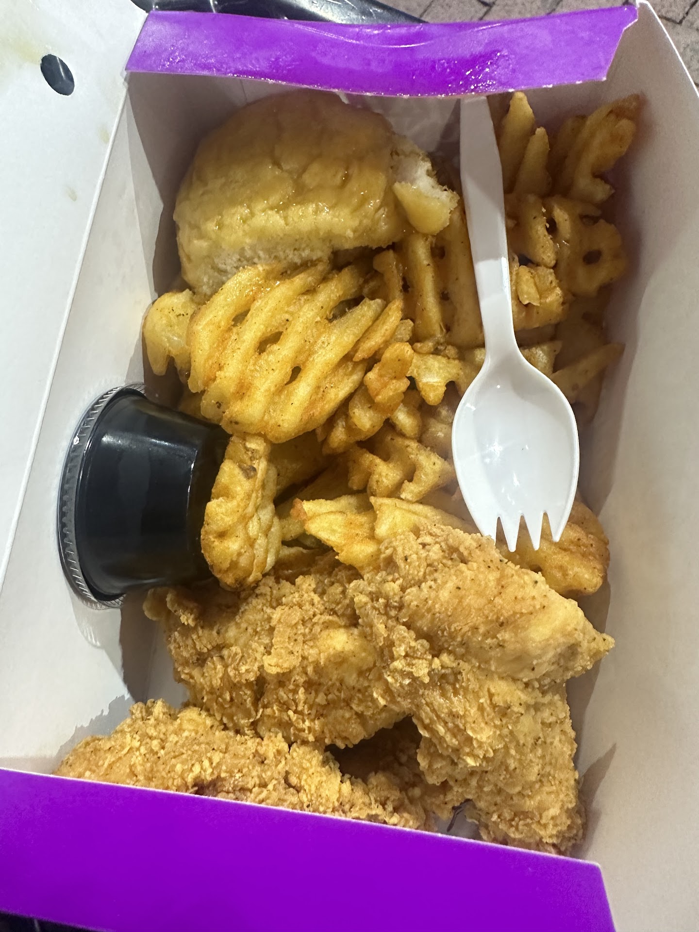 Read moreSo this was an interesting one, because the graphics drew us in, but locals told us it was mediocre. There wasn't much else open at that time of night, so we decided to give it a try. The people that told us not to go must be biased towards someone else locally, because we both thought it was delicious! The cook made our chicken fresh after we ordered it, with marinated meat going into breading then into the fryer--no prebattered frozen chicken here! The Voodoo Sauce was tasty, and so was the Hot Honey, but it definitely had some heat to it. Hot fresh waffle fries right out of the oil too. I can't guarantee it's like this all hours of the day, but sure made our meal outstanding. The price might seem a little high, but the chicken tenders were HUGE! The two of us shared a 5 piece and it was more than enough. What I liked most about the chicken was that it had its own signature flavor and style; they aren't trying to duplicate Willie Mae's here or anyone else for that matter. There are several chickens houses in New Orleans, and they all have their own identity by flavor and style, which I love.