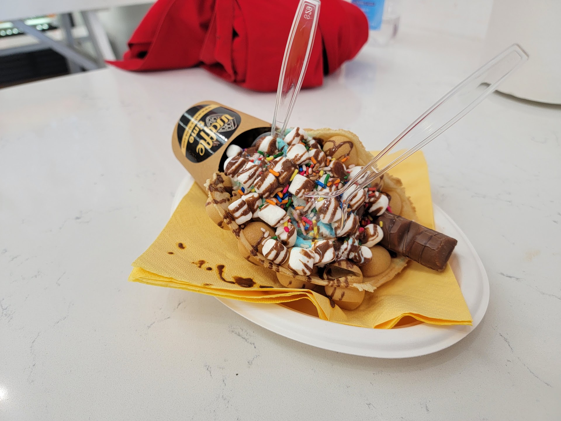 The person helping us, however... struggled a bit. I had to repeat my order a few times despite reading directly from the menu. She started scooping a different ice cream than I had asked for, then argued a bit that the strawberry waffle came with vanilla (which the menu did not say; none of the items specified a particular ice cream flavor as far as I saw). When she was done, she handed me this giant waffle filled with ice cream and fruit with no bowl, plate, or cup, so I had to ask for one.