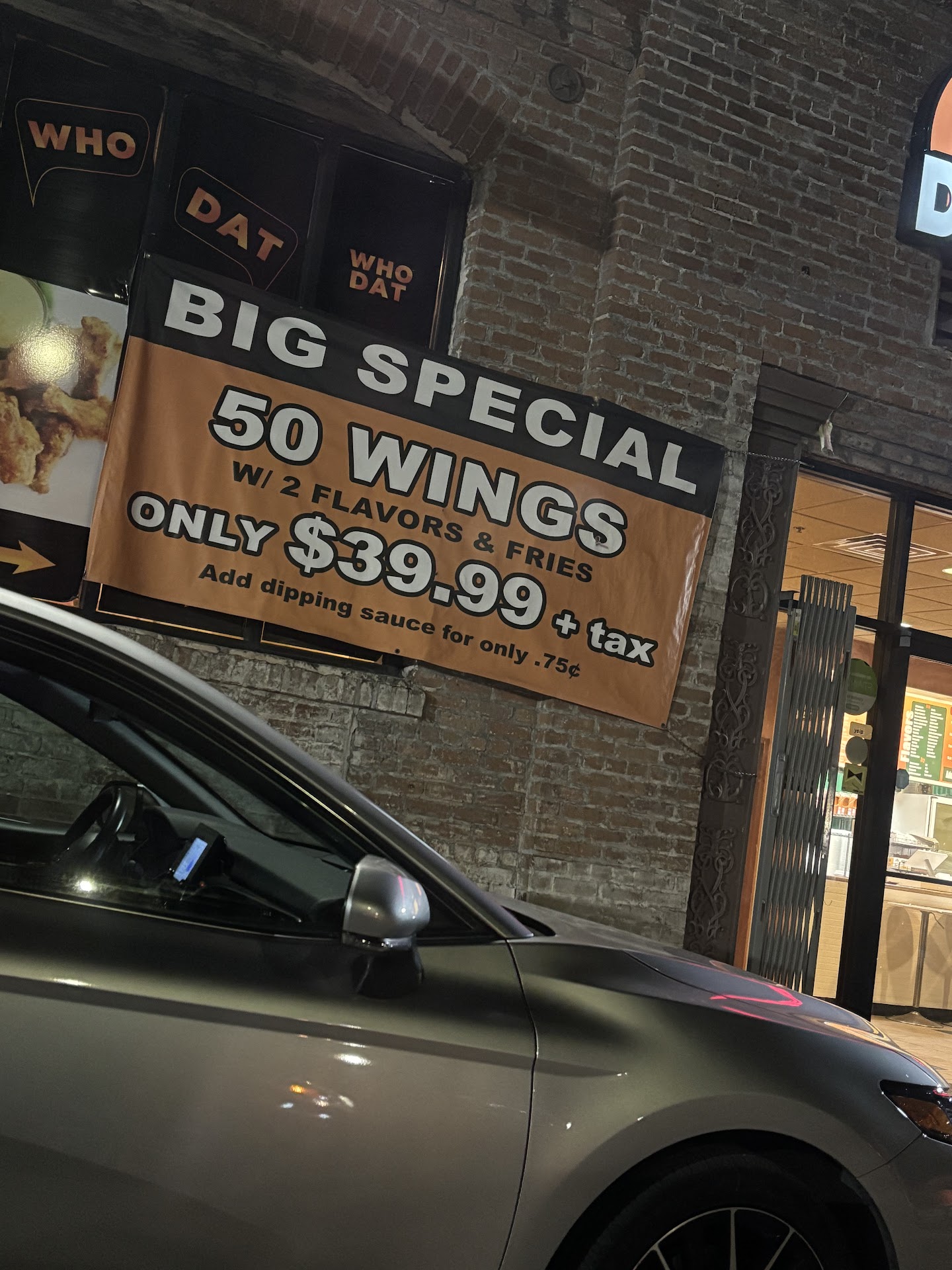 Read moreI just ordered a 20 piece ( Orginal Hot wing) and ranch fry plate from Uber Eats from “Who Dat Wings “ this exact location and EVERY SINGLE last one of those 20 wings was AWFUL ! I contacted ubereats NO LUCK! But this was very unfair that someone can spend such a big amount $40 total on wings and fry’s just for it to be distasteful! I’m very annoyed I thought I can order a quick wing plate over night bc I was hungry did t wanna cook . I wasted my money almost $50 on wings this was NOT fair to me ! Whoever is behind that counter buring people wings count your days . It was a privilege I chose “Who dat wings” after all the BAD Reviews I’ve seen and heard over the years of YALL beimg in business but I always give someone a shot to see on my own and I was let down and VERY disappointed! All 20 Wings burned ? The burning stench was quite high in my nose before I even opened the plate! NEVER AGAIN . Now I just have to count...