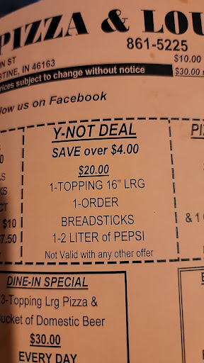 Read moreFirst time visit to this pizza joint. We received coupons in the mail. We decided to use the "Y-Not" deal coupon- large 1 top/ breadsticks/ 2 liter $20. I called in, told them the coupon I had, gave them the order ( half pepp& half mushroom). They gave me a total- $21 and change, pick up in 20 min.