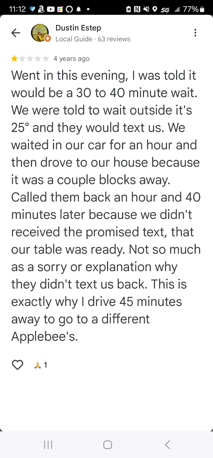 Read moreAt least they are consistent. I live less than 5 minutes from this restaurant butt stopped going here years ago because of the service. I took my niece out shopping today and we had an hour to go get lunch before we had to pick up my nephew. We arrived at the restaurant at about 10:55 as an employee was opening up the doors. We walked in side and were greeted with a "is it 11 yet". We immediately walked out after the rude comment. I decided to walk back in to let the manager know about his employees comment. He replied "what time is it?" to me. I told him I was aware of what time it was and asked him if he thought it was appropriate for his employees to be rude to the only paying customer in the building. He changed his tune and said no. He did offer to pay for our lunch afterwards but I will never eat at that place again and declined his offer. This is why I drive an hour to go to the Applebee's north of here. Attached is the photo of the review I gave 4 years ago on my last visit. Maybe I'll give you a try in another 4 years if you're still...