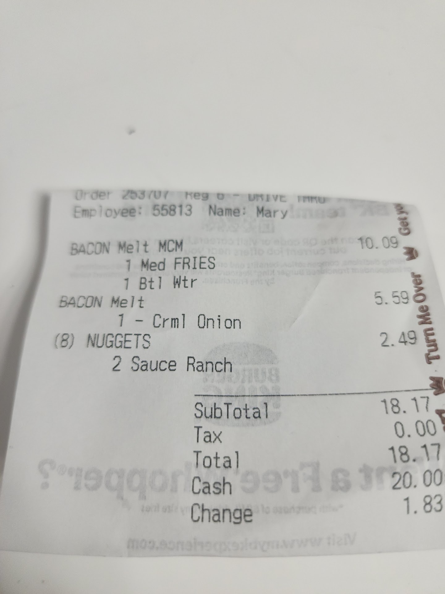 If your a vegetarian or vegan or just thinking about trying the Impossible burger, don't. I've tried them 4 different times ( only at the New Philadelphia location ) and every time they are way over cooked. They're flattened out and dry. Like eating cardboard. It's a shame too because I've eaten these burgers before in different establishment where they were cooked properly and they were delicious but Burger King hasn't got a handle on this....