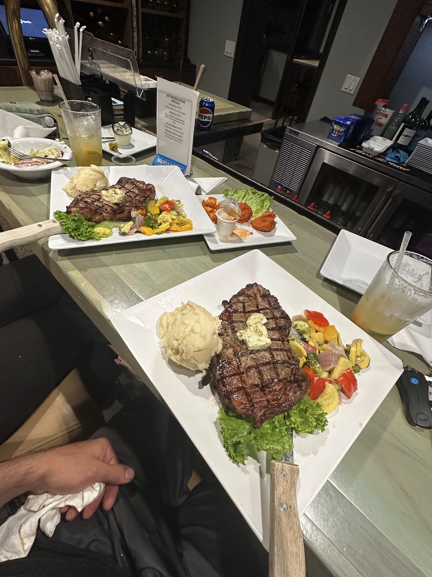 This was our 1st time there. Our server was attentive in the very beginning but after that he completely ignored us. All of the servers seem to gather near the kitchen & talk, completely ignoring their tables. Finally a manger came by & was able to get our server for us. For an appetizer we got the fish dip & it was very good. Not sure that black olives are the thing to serve with it. Kinda strange. I ordered the shrimp (blackend) & grits. The shrimp were excellent, however the grits were 100% tasteless, even adding salt, it still was terrible. There was zero flavor. I ate the shrimp & left the grits. My daughter ordered a salad & we were kinda shocked that all it came with was black olives, and million onions. Very bizarre. Obviously we missed the salad description...
