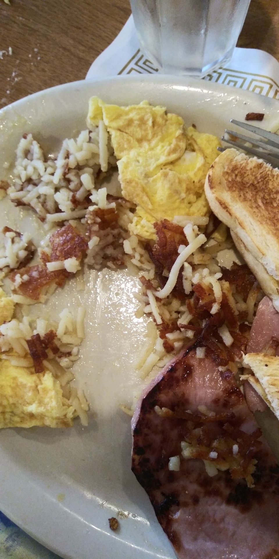 There are, however, a few areas that could really improve the experience. The biscuits were quite dry, and several of our dishes (my plate, my friend’s plate, and her bowl) had noticeable cracks. It would make a big difference to replace dinnerware, both for safety and presentation. The women’s restroom (two stalls) worked fine but felt a bit cramped and outdated. The water had a strong chlorinated taste, which carried over into the coffee.