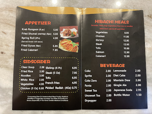Read moreI am very disappointed with this place. My wife and I noticed this place a couple of weeks before it opened while were driving and stopped because the food on the posters looked great. Fast forward to today we see the place is open and go inside to order. First off the place wasn't clean. It was as if they just threw the place together so that they could open without fully cleaning up the mess from the construction. Then we looked at the menu and quickly realized that what was on the posters on the window was not on the menu. My wife went outside and looked again to see what we wanted. We tried to order what was pictured and the man behind counter said "we don't make that. The pictures are just there to get people to come in." They literally admitted to falsely advertising other people's food to attract customers...lol. Because I had to work we just ordered a chicken hibachi meal and left. The food was bland. The fried rice was more like steamed white rice with globs of soy sauce thrown on it. It was definitely not worth the price we paid. We will not be giving them any of our...