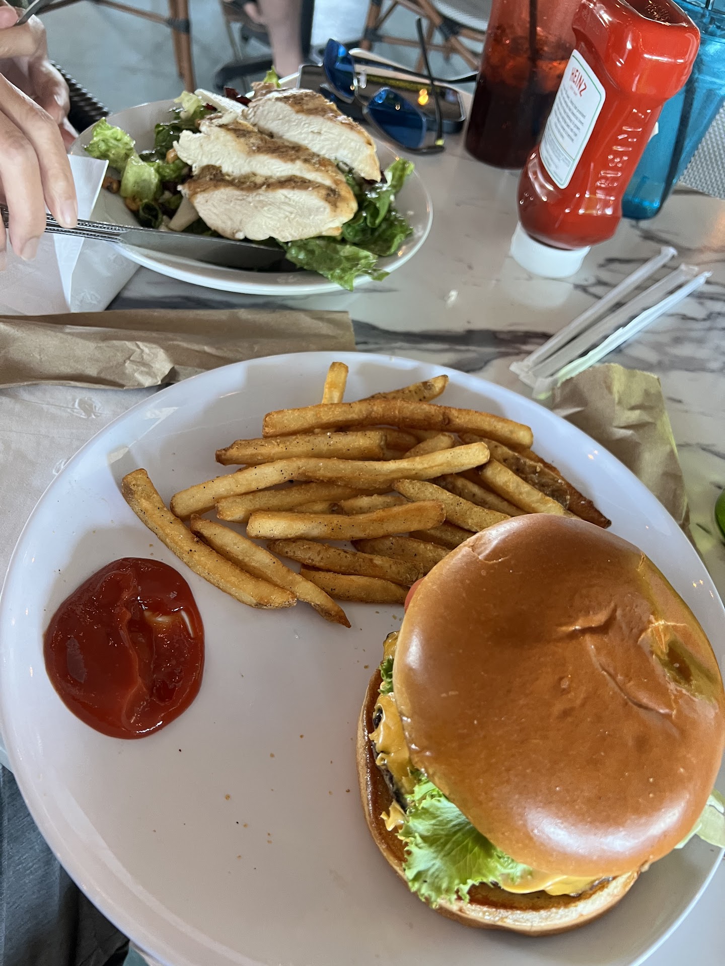 We decided to lunch at Sunset Cove today. Really wanted to like it, so perhaps we’ll give more time for them to improve. Firstly, we were seated quickly, not very many people there for a Saturday at 12:30ish. But then we waited 16 minutes before anyone approached our table to just order drinks. and yeah noticed staff standing around while we waited for someone to approach our table. Then we noticed food was slow to come out. We don’t mind waiting, but it really wasn’t that busy, would hate to see the delay if it truly was busy. Oh,. Women’s bathroom, even though just opened, stall out of order. (Note it’s been out of order for a week according to others) While we were waiting for food, (because you know if you go to the bathroom that means the food will arrive! lol, ) another couple that had been seated walked out after saying out loud that they had been waiting a while for service. So it just wasn’t us. Then our food came. The burger was just a regular preformed patty, not much taste and definitely not very juicy. She got a salad and ordered chicken protein. I like my fry’s hot, and they were lukewarm when arrived, in addition to being $3 extra for fries instead of potato chips. Come on, who eats a burger with potato chips?? Her salad? Barely larger than a regular side dinner salad. Which brings me to pricing, $19 for a smallish bowl of salad and $17 for a mediocre smallish burger and lukewarm fries.