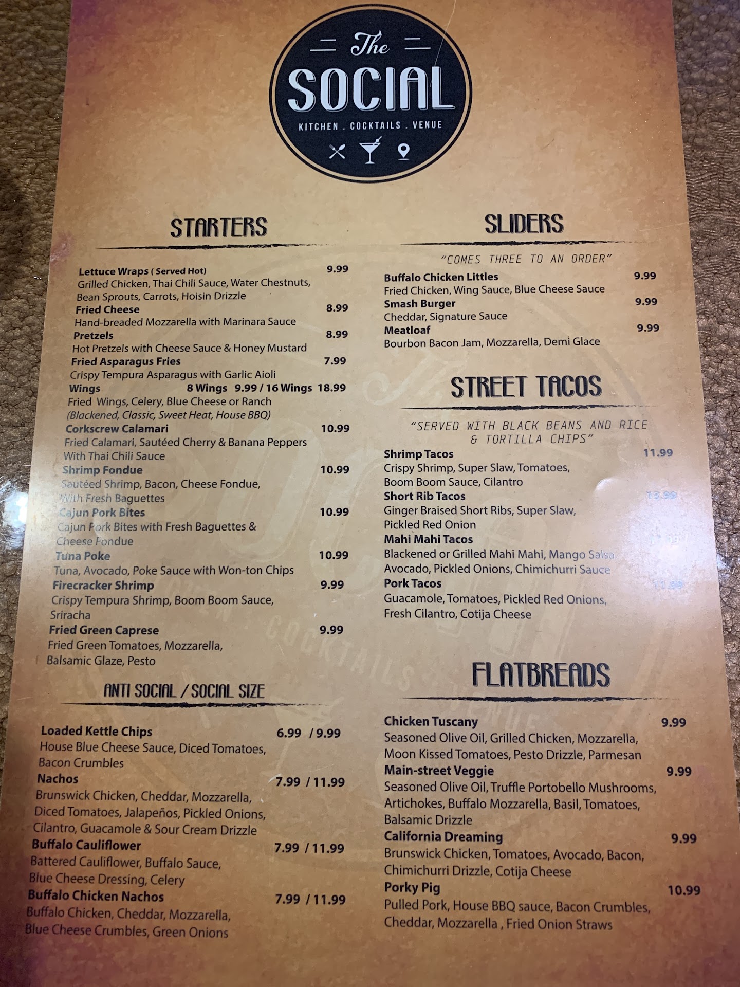 Read moreBeen to the Social many times and always was pleased with the food, drinks and service, but last night by far was the worst experience, did new management take over because it didnât seem like the same place at all? First of all they werenât that busy, our drinks came to our table watered down, must have sat at bar for a while because the ice was half melted, I asked for a lime in my drink, no lime, so I asked the waitress if she could get me a lime again but after 10 min I had to go to the bar myself and get a lime. We ordered a couple of appetizers and our main dishes (four in my party). The apps came with no problems but shortly after the waitress comes back with a menu in her hand and informs us that they were out of grouper, my son ordered the grouper tacos, so he switched to the Mahi instead. Then 10 min later the manager on duty comes over to inform us that they ran out of pork, we had ordered the pork nachos so we had to switch to something else once again. At that time I explained to the manager our frustrations with water downed drinks, poor service and running out of food, not one but two different items that we ordered. He apologized and explained they had a new kitchen manager that was trying to get used to everything. He comped my drink and made me a new one in an effort to make things better, but that one too was watered down, he never asked me if it was any better. My wifeâs drink came in a chipped glass that cut the inside of her lip, I had to go to the bar and ask for a new glass because that one was chipped. My son drank all of his soda, not once did anyone offer to get him a refill. Once all of our main dishes came out, 2 out of the 4 dishes were okay while the other 2 were not the standard quality that weâve received in the many past visits. My wife ordered the Downtown chicken pasta, the chicken was so dried out she couldnât cut it with here knife, the pasta and sauce itself was dried out. I had the bacon jam sliders that too were dried out and over cooked. We asked for the manager again and explained what was wrong, he again apologized for the experience we were having and hoped we would come back and give them another chance. We returned our meals uneaten and the manager took our 2 meals off the bill and comped us 25% off everything. It was a nice gesture but still paying over $100 for a really bad overall experience, subpar food and water downed drinks from the ice melting too rapidly or just sitting up at the bar too long, I canât say I will ever go back. There are too many other great options in that area, the Social has to realize they need to be on their A game all the time, otherwise their local competition will pick up their market share.. Also, to add to this, we weren't the only dissatisfied customers, there were at least 2 other parties there that I witnessed walking out very unhappy with there food and service as well. I hope for the sake of the rest of the customers, the Social management team gets the issues sorted out quickly otherwise Iâm sure more will feel the same way as I do and spend their...