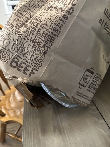 Our latest order they literally threw our food in our bag. See photos. It caused everything to leak all over my new car. One of our meals had barely any food in it. See photo. The burrito wasn’t even together and was totally ripped. Every other chipotle would redo it or double tap it. Not this one! We ordered a large bag of chips we got a small.