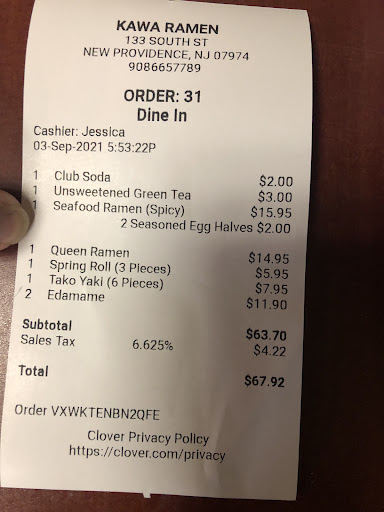 My husband and I were excited to hear about a ramen shop and drove about an hour. ThIs place is the size of a small diner but on a corner with little parking behind the building. Greeting was with a half-hearted smile and a “you can sit wherever you want” was all we received. The table we sat at in the corner felt sticky. Ordering drinks on the menu like Thai tea, unsweetened green tea and club soda, we were told no Thai tea (no alternate option suggested) then given a can of seltzer and a bottle of cold unsweetened green tea and never advised that they don’t serve any hot beverages. I eagerly awaited my hot steaming bowl of ramen, especially since I didn’t have lunch I expected it to taste even better. Edamame was edamame, can’t go wrong. Shu Mai was okay, like any take out Shu Mai. Spring rolls were crispy on the outside but didn’t have shitake mushroom and the veggies had a mushy consistency like the kind you by BJ’s/Costco. Tako Yaki had a mushy exterior and the inside was rubbery (I brought the rest home and my son described the texture as if chewing on a dog’s chew toy).The Spicy Seafood ramen bowl was not spicy, bland and lacked flavor, especially the umami-ness. The Queen bowl was ok but lacked more than the other. The ramen bowls looked decent but lacking any pizazz and the ingredients you read on the menu had you wondering where they were in the bowl. We did order Gyoza and, even after mentioning it, never received it but was charged for it. We had to get our bill redone. We left very disappointed. Many changes would need to happen before any sort of revisit here which is a shame since it is so close to where I work. For the price of our meal, you would think there would be better ingredients or made there but everything tasted store bought...