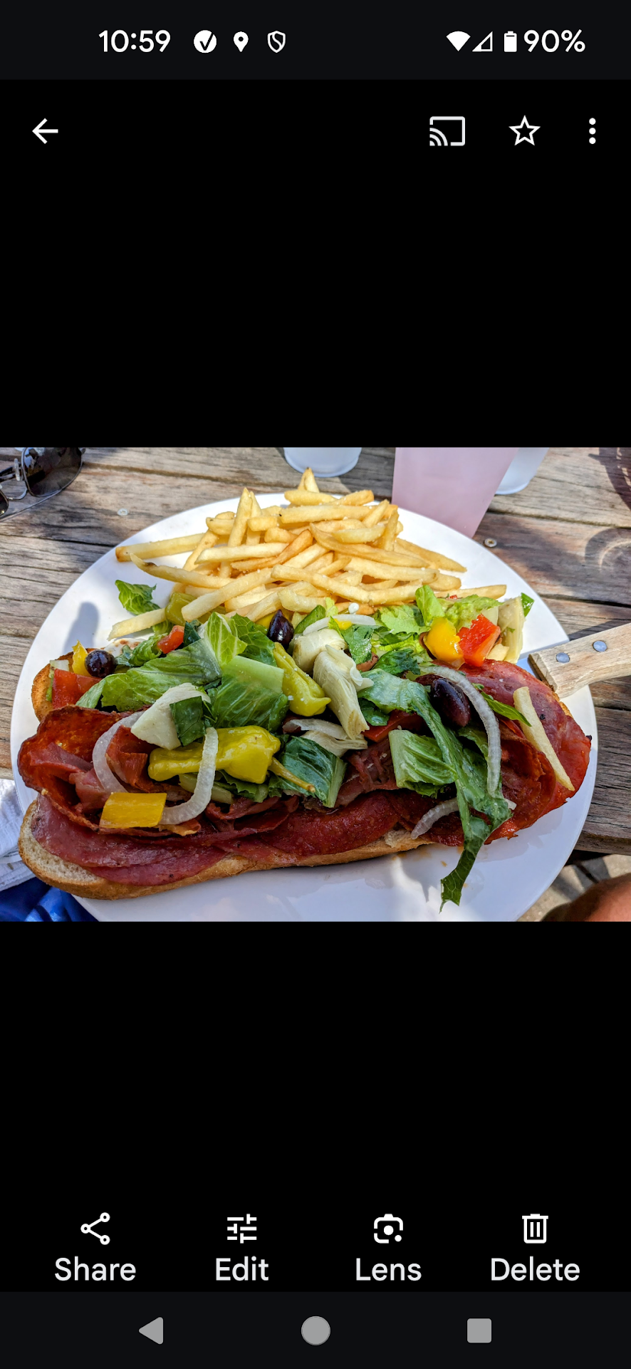 We were famished after walking to Southeast Light. We stopped on our way back to the center of town and asked a COS for his recommendation. Although a bit out of the way, we walked past many restaurants in the downtown area and found Poor People's Pub as directed. Our initial reaction was a bit of disappointment. Having been out in the sun, walking, for close to 5 hours, we just wanted to sit inside and relax. The hostess indicated we could a) sit at the bar (no thank you) or b) sit outside (no cooling off in a/c). There was a 'bigger' table inside but she said she needed to keep that open for larger parties. We agreed to sit outside and then were seated at a 'wine-barrel' type hi-top table where we had to sit bow-legged for the entire meal...a bit uncomfortable. Meanwhile, there were 2 nice looking empty picnic tables that sat empty for most of our meal; about 10 minutes before we left, they sat a party of 2 people at one of them. If I had known, I'd have asked to be moved, but assumed we'd be told the large tables are for larger parties. Onto the meal...because so far I wasn't feeling like we should stay. My husband ordered the steak frites sandwich; I ordered the Italian. Our meals came with chips but we decided to upgrade to fries which were an additional $2. When our meals came, they were definitely ample servings for the price. There was no way either of us could pick up our sandwiches and eat them...we needed forks & knives! Eating outside, there's a caddy on the table with plastic cutlery, plenty of napkins, and condiments. My plate had arrived with a good sharp knife from inside, but the plastic cutlery on the table was the low-end stuff that bends if the slightest amount of tension is put on it. After managing for about a third of the meal, we finally flagged down the waitress and asked for flatware from inside. She was very accommodating. My husband enjoyed his meal, but seriously, my sandwich was the star of this show! It had everything(!) on it...peppers, olives, pepperoncinis, lettuce, artichoke hearts, onions, etc. etc., along with melted cheese, toasted bread, and all the Italian meats! First time to Block Island and if/when I ever go back, I'm going to want this "sandwich" again. It...