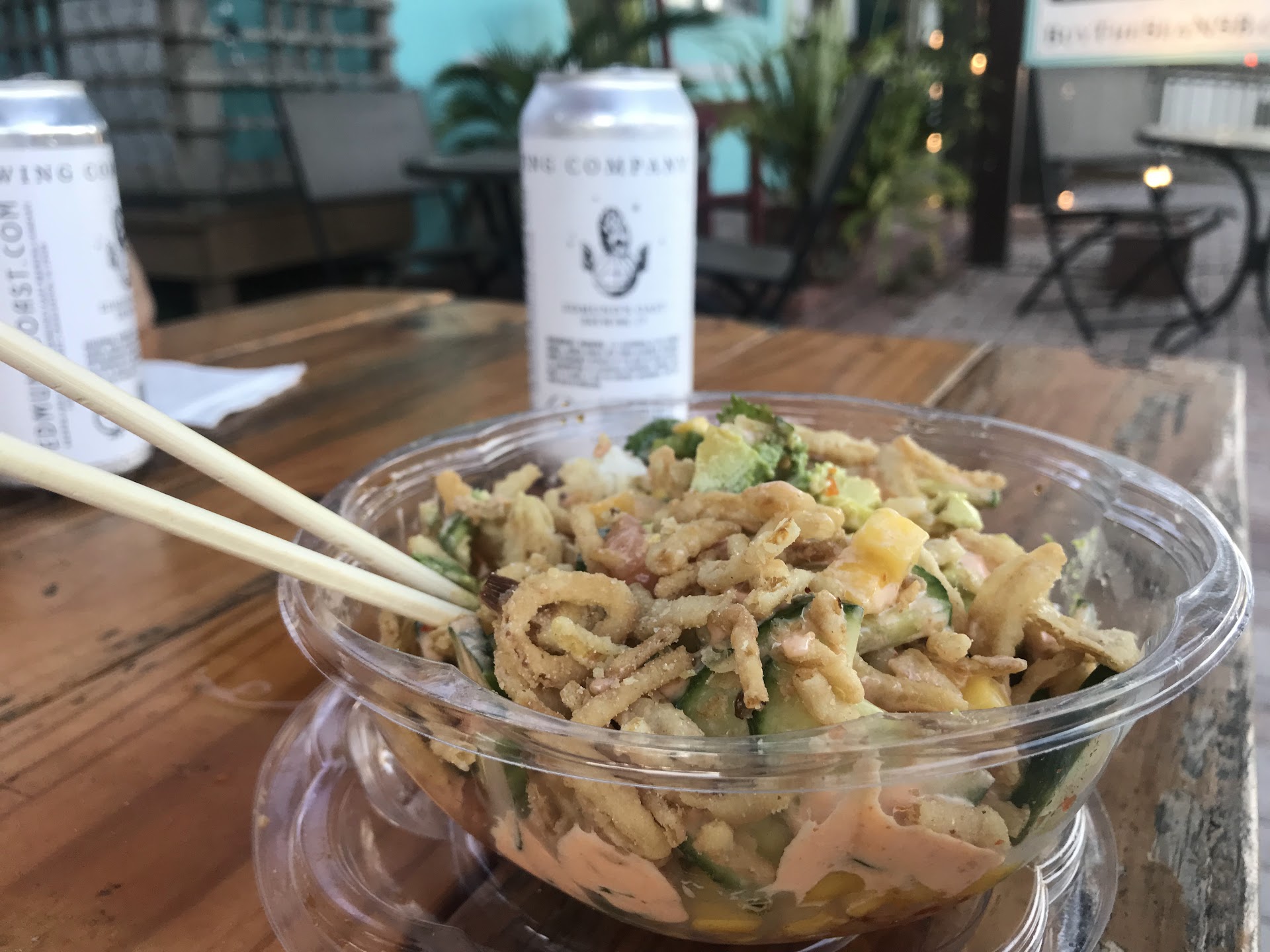 This is a great lunch spot on Flagler. The staff are really friendly and the place is really clean. The food comes out quick no matter how busy they seem to be. They also have a good selection of craft beers in cans. The poke bowls are pretty big. I am always filled up by them. There's a good variety of options for the poke bowls, and several protein options, like tuna, salmon, tofu. A good deal for what they charge. Seating is all outside, next to the sidewalk. It's a nice place to sit, eat and people watch. There's also usually a rooster or two that come and say hi.