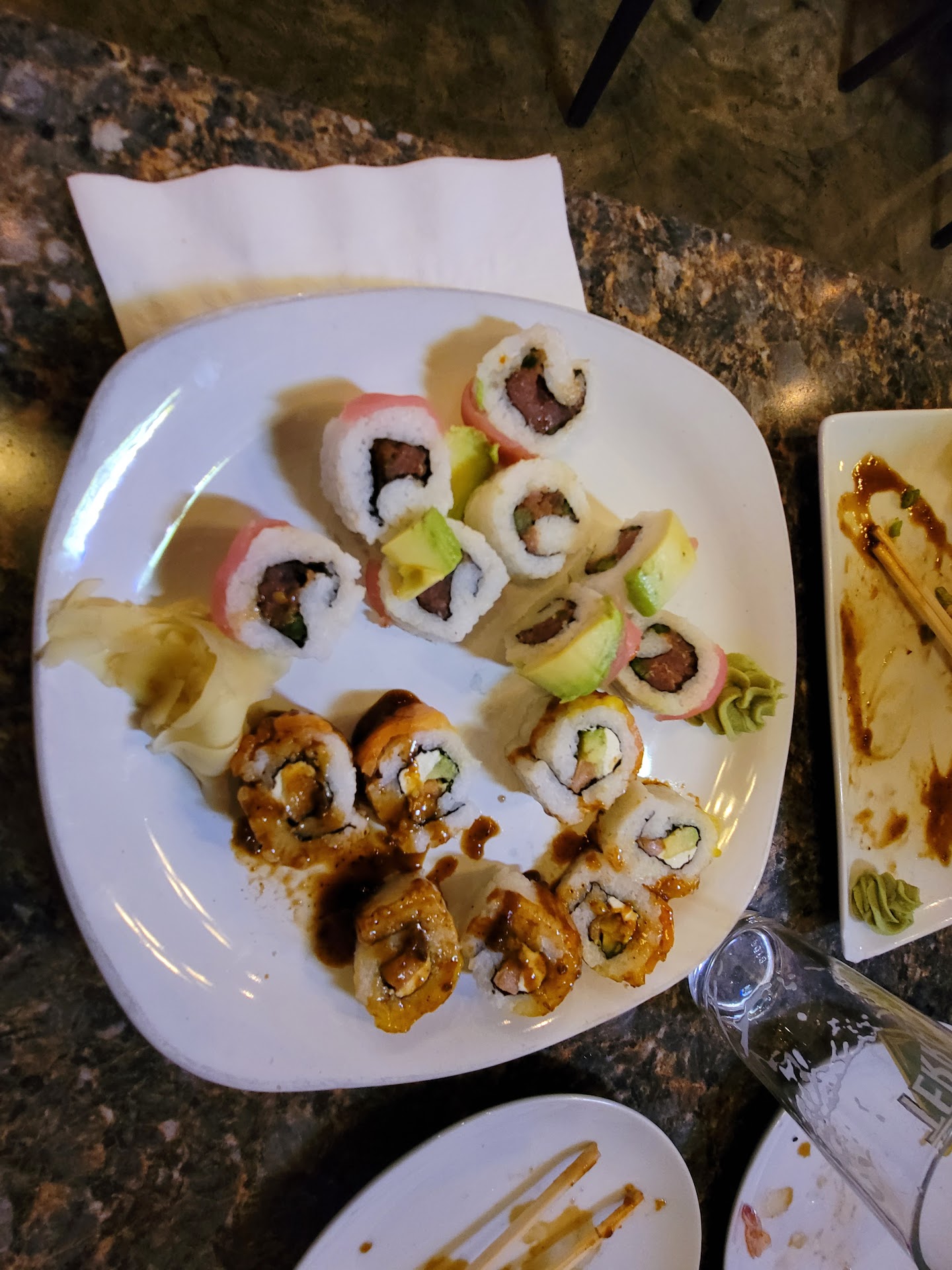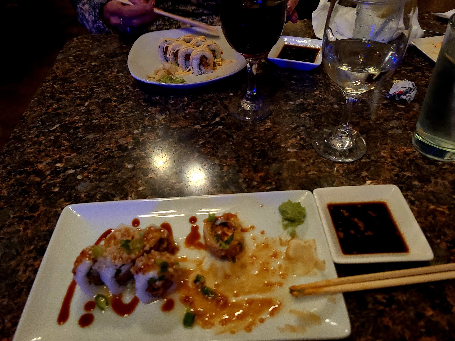 Decided to try this sushi place, I should have passed. It is a very small and very crowded place. Tables close together and difficult to navigate when occupied. I need a cane to walk with and had to go completely to the back of the restaurant to then get out because there was no room to move between the tables.The table bases are exceptionally large and oddly shaped, so I could not even get my legs under the table to sit properly. The online menu does not match the in house menu and when I asked about an item, the waitress was confused, instead of going to find out from the chefs, she simply said the item was probably not available. They have a large selection of very interesting sushi rolls with both raw and cooked proteins. Their edamame was tasty and served piping hot. I tried their crunch roll and it was tasty. I also ordered their JB roll. But was disappointed, because they had either brushed the sushi roll rice with wasabi or had wasabi all over their fingers when rolling it. Nothing in their description indicated they used wasabi paste on all their rolls! Blech! The salmon sashimi served had been previously frozen and was aging. It was grainy and dry. The pieces were small. I will not be returning...