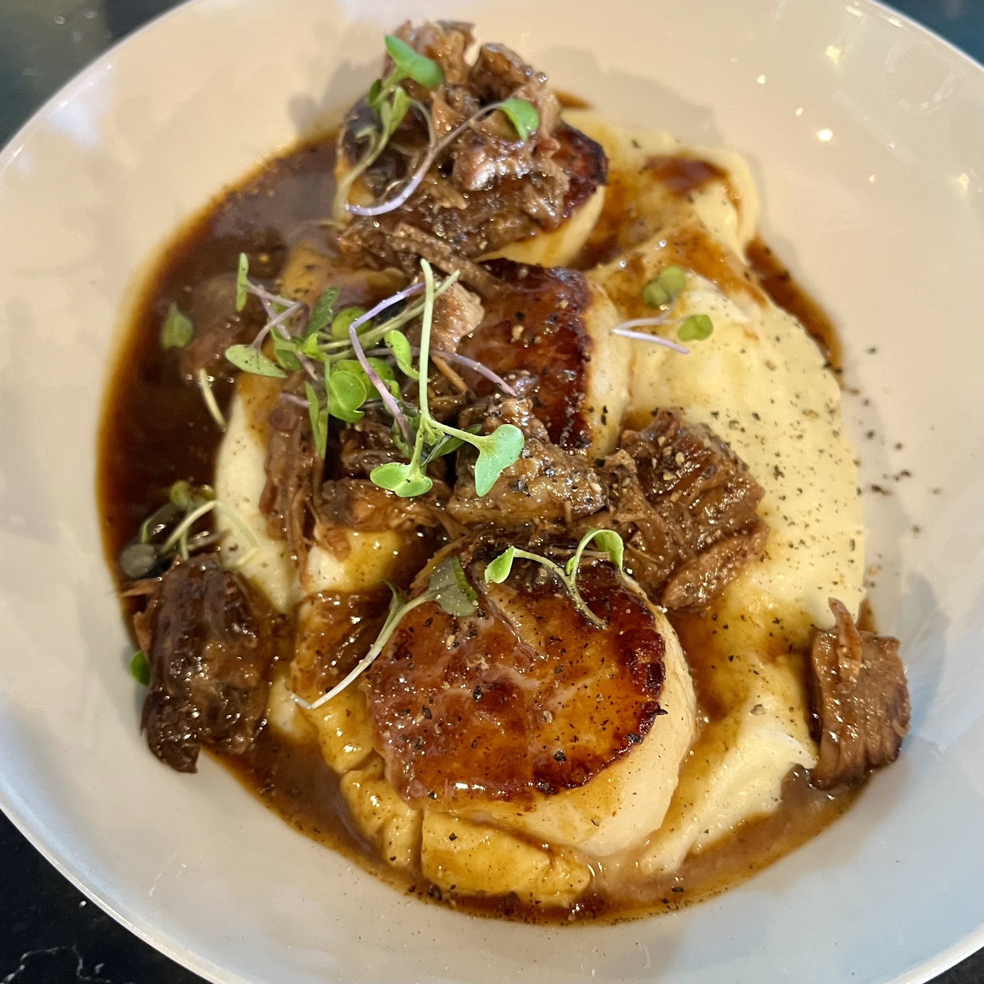 Decided to try another one of NSB’s best and it absolutely did not disappoint! Arrived at around 4:15pm and sat at the bar. My server was friendly and was quick to get me water and bread while I looked over the menu. Decided on the sea scallops & short rib served with truffle mashed potatoes and au jus, which was just fantastic! The three scallops were large, perfectly cooked, tender and delicious, the short rib was also incredibly tender and flavorful and the mashed potatoes were top tier, the truffle was noticeable but not overpowering! Their bread was also incredibly fresh and good, nice crunchy crust with pillowy soft insides and was right out of the oven, so the salted butter they provide melted right into it— Heaven! I decided to snag a piece of the caramel cheesecake to go, which was also a wise move, because it was creamy, sweet, and had a lovely caramel flavor throughout. I will undoubtedly be back here more often, even though I live around 40 minutes away! My only critique (and it’s a pretty minor one) is I would have preferred the short rib to be one large cube instead of several smaller bite sized pieces. The large cube would have been more photogenic, but from a flavor standpoint I suppose it doesn’t matter.