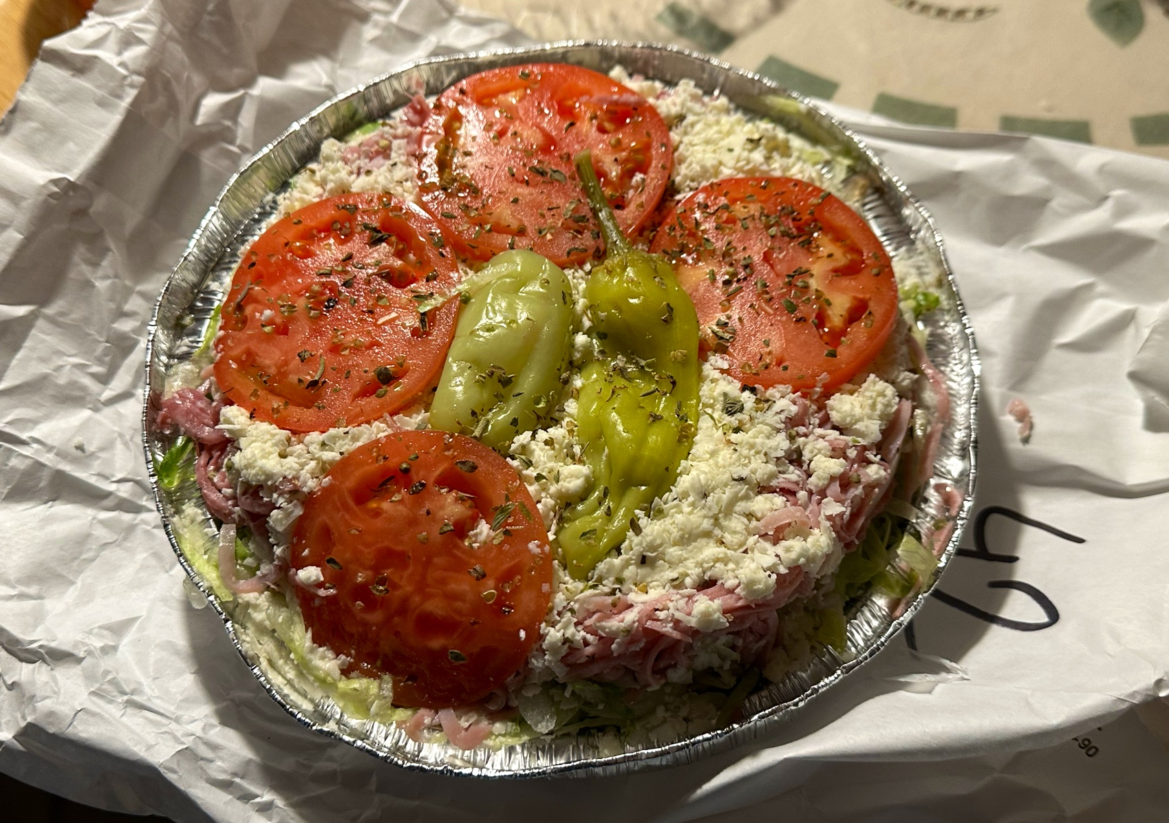 The first time I called I was put on hold for almost 10 minutes. I tried to call back a few times, and the line rang busy each time, and then I finally got through. I was told our order would take 20-25 minutes. It ended up taking 50. We ordered a large pizza with half specialty pizza the “House Special” (Cheese, Onions, Peppers, Mushrooms, Pepperoni, Hamburger, Sausage) with no hamburger and half pepperoni. We also got the Greek Salad.