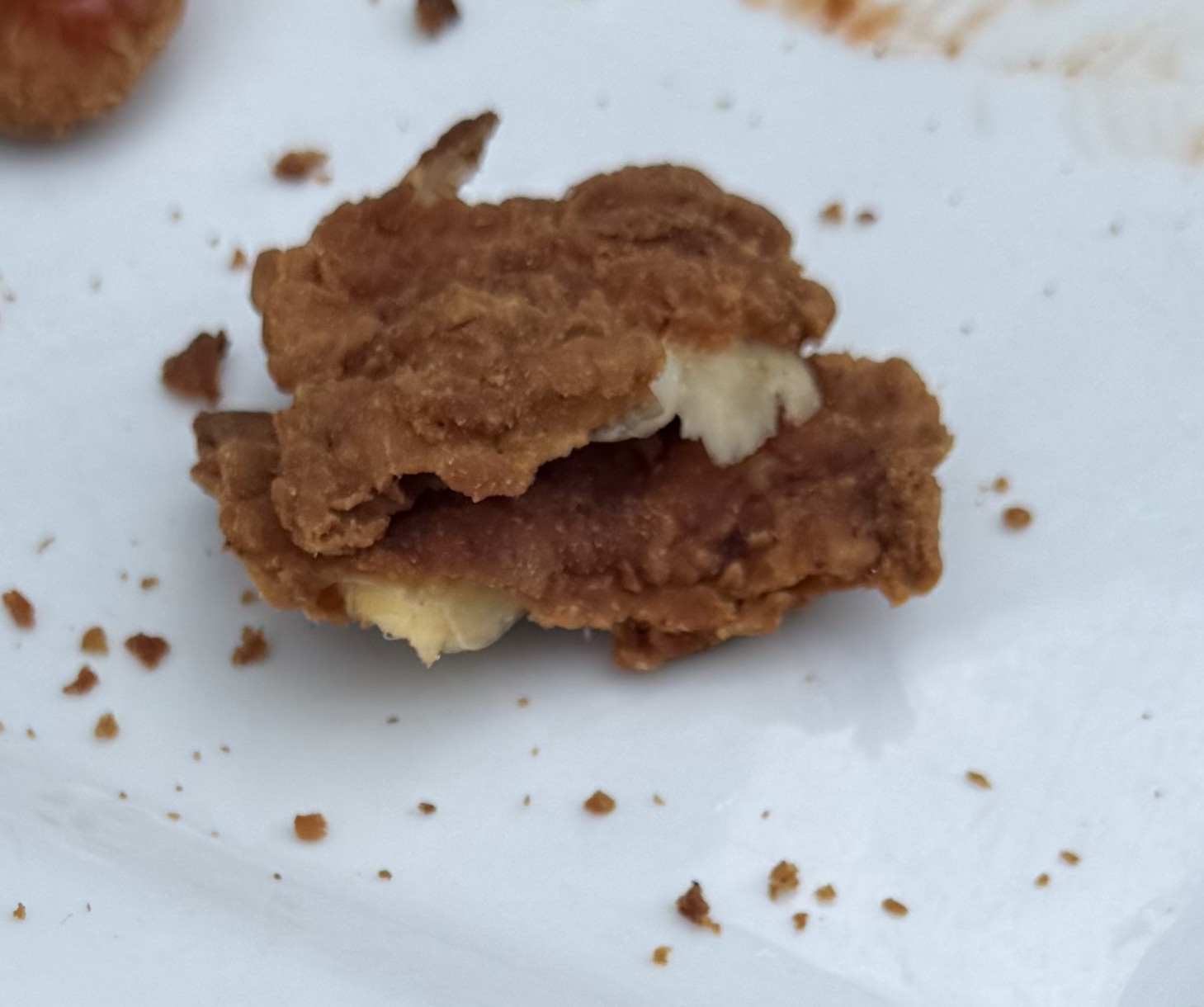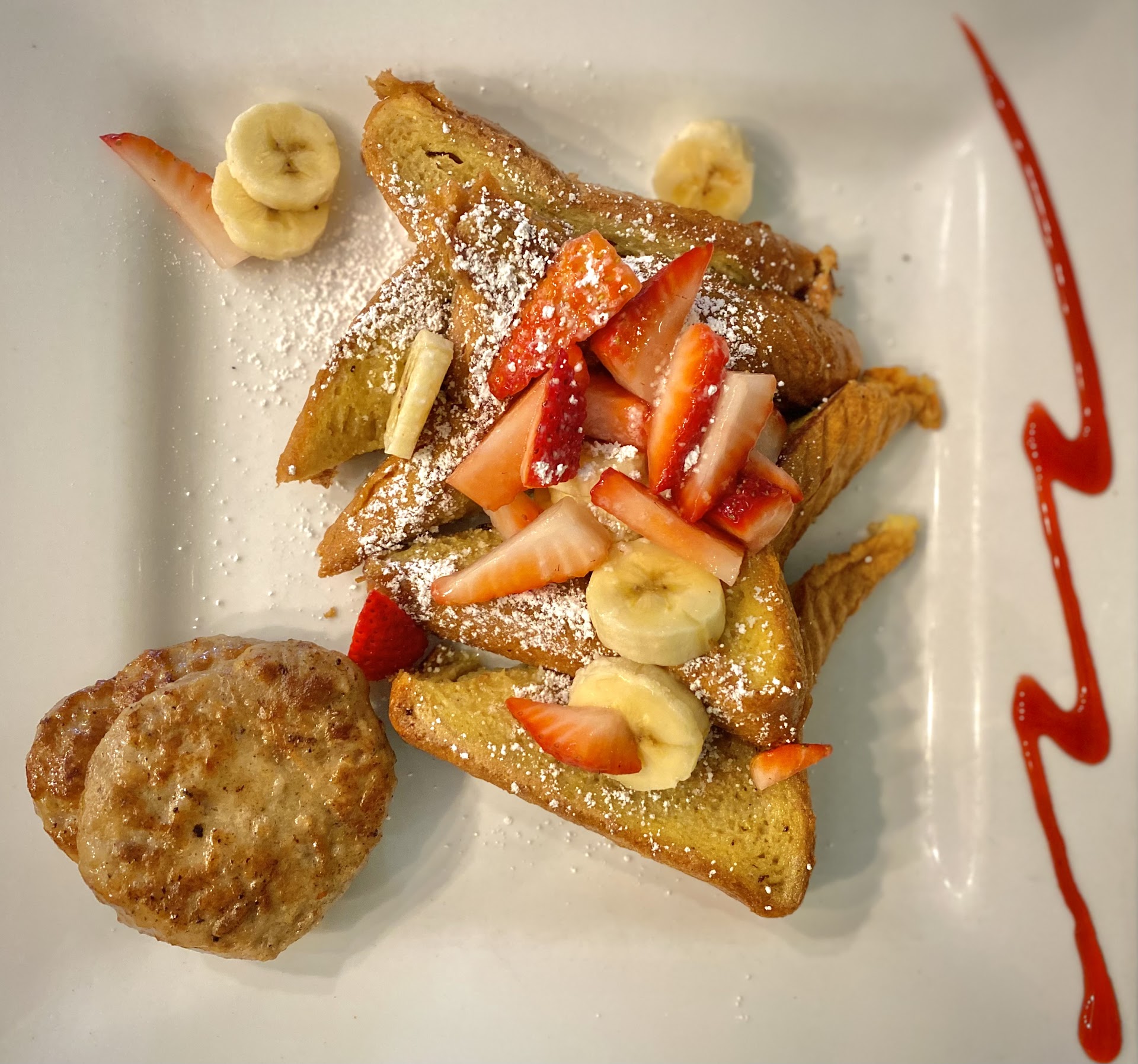 Pictures include: strawberry banana french toast, latte with almond milk, single espresso, hot honey chicken biscuit and hash browns (honey is on the bottom; get an extra napkin; heat is a 3/10, you can handle it); avocado toast on sourdough w/ over easy eggs and hash browns, and Dulce de Leche toast bites.
