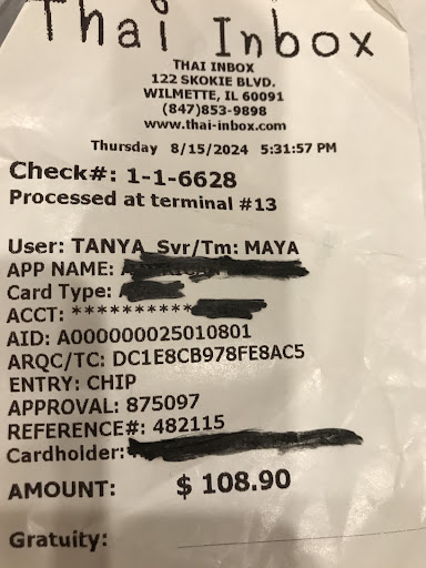 Zero stars. Don’t eat here! I Should have realized, since this place looks like a dump and dirty, disorganized, ONLY CARRYOUT. Spent $108.00 for Horrible tasting Thai food: everything was WAY OVER sugared; Basil beef fried rice had exorbitant amount of sugar, as did horrible, yes horrible, tasting ginger chicken, had no fresh ginger; cucumber salad had sugar syrup, gross; pad kee mao, no jalapeños over sugared NOT EDIBLE, didn’t even want to try sweet and sour chicken bc I already got a stomach ache from everything I tried, could NOT FINISH MY SMALL BOWL OF FOOD, that BAD!!! Called and asked why so much sugar, she replied it’s their recipe??!! Asked me if I asked for low sugar, NEVER HAD I HAD SUCH DISGUSTINGLY over sugared HORRIBLE THAI FOOD… sugar overload, going to call AMX FOR A CREDIT. Who puts this amount of sugar in everything???? They can keep their recipe; just a dirty disorganized take out hole in a strip mall in Wilmette, thought I’d give them a try since they go by the name of Thai inbox that is in Glenview, Illinois, BUT IS DEFINITELY DELICIOUS AND NO SUGAR, cannot believe they serve...