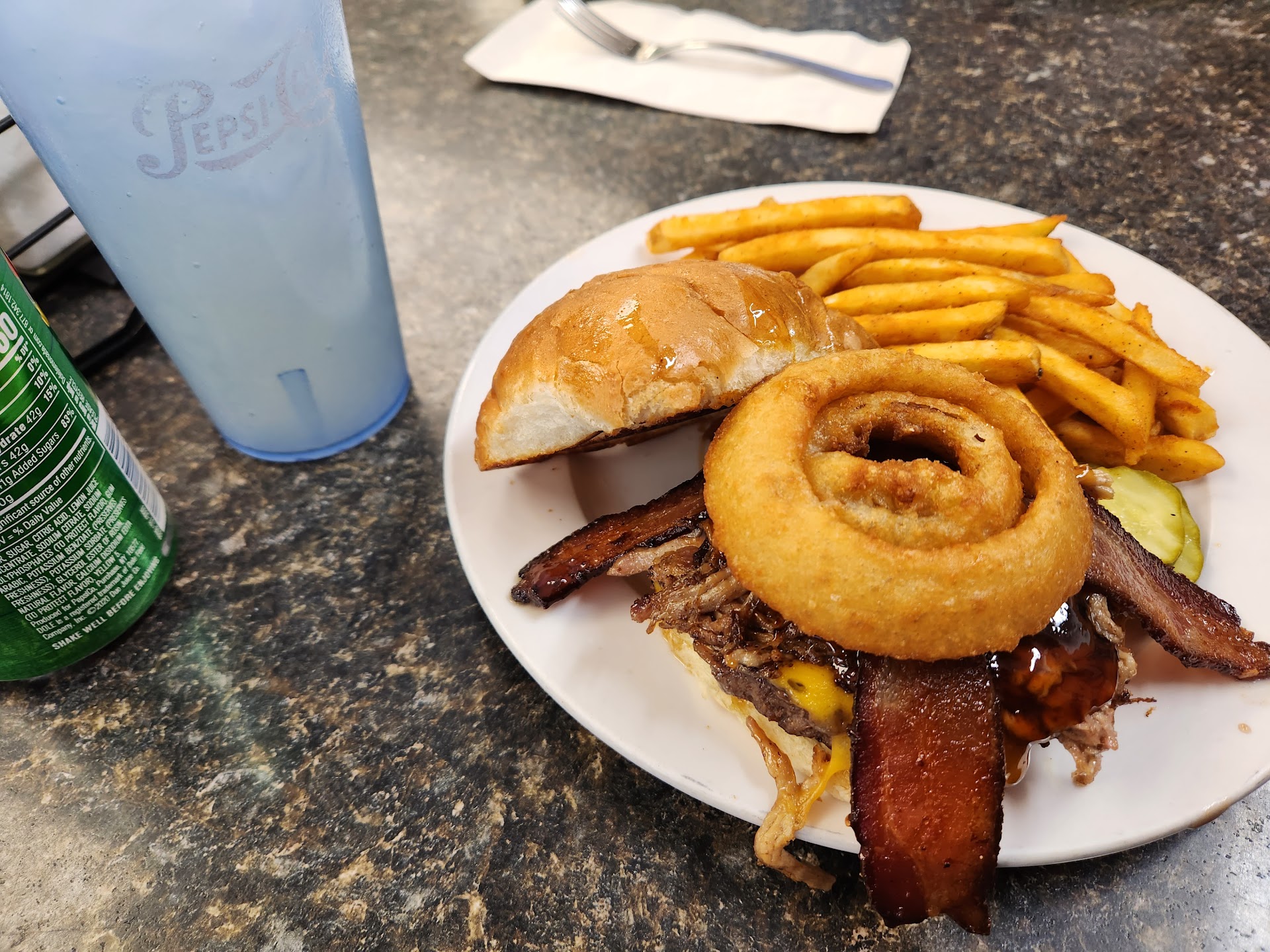 The burgers are different and taste oh so good! I had the Blue Burger the last time I was here in 2017 and it was great. Today (2018) I had the Ultimate burger by Phil. A burger topped with cheese, pulled pork, BBQ sauce, and onion rings. I wanted to give it a shot and thought it would be a bit over the top. It was great! All the flavors blended together very well! They have a ham and pineapple version which looked good, a sweet and heat burger with jalapeno's, and a Fun Guy burger which is a mushroom and swiss. (Get it?)