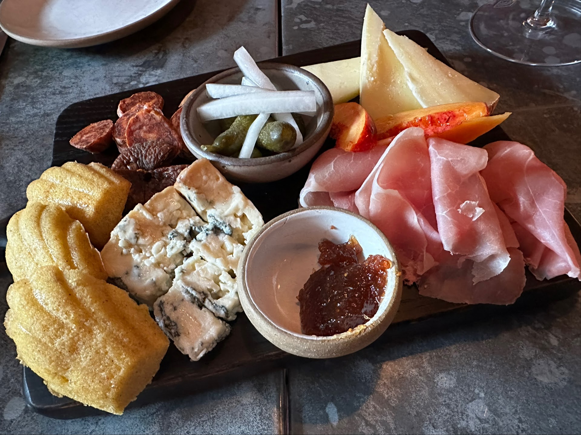 Charcuterie and Cheese board was delicious, served with delightful accompaniments (e.g. pickled watermelon rind, candied mulberry seeds). Toast and Cornbread were similarly excellent. Atmosphere was great. Staff slick, knowledgeable and warm.