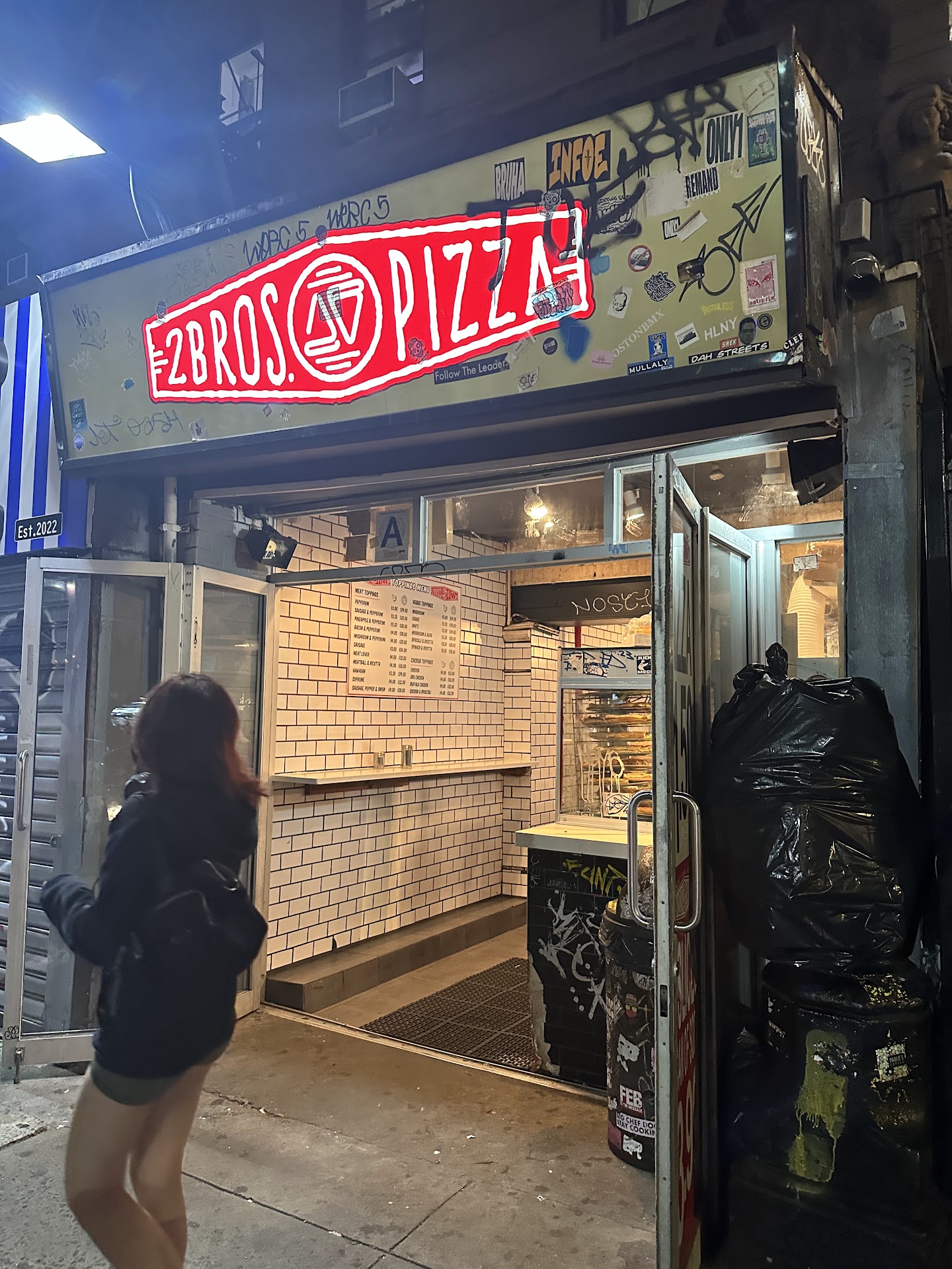 I am in East Village pretty often and had stopped in many times before for a late night slice on St Marks Place. This establishment is no frills...especially at night when they close the inside and you are not able to sit. But that is no problem as there is a countertop adjacent to the cash register that you can lean on and it has all the spices/seasonings that people like to put on their pizzas. I knew that this was the place to bring her. We were having dinner nearby at a nice place and I also remembered that 2BROS are open pretty late so the timing was actually perfect.