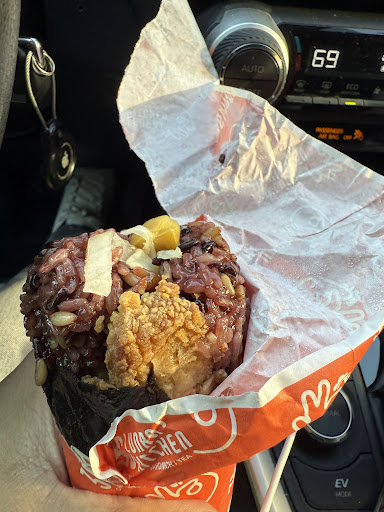 I figured I’d have a quick bite in my car, but this thing was hefty. The sushirrito was packed—purple rice, lettuce, that bright yellow pickled radish, and a good amount of crispy fried chicken. It was surprisingly good! The peach lemonade, though, I’d probably skip next time.