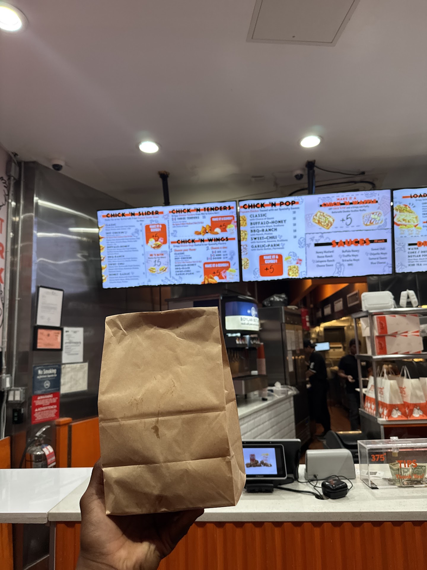 Ordered the 3 chicken tenders mild. Found a hair in my food and I saw one of the guys in the back chewing on something black that he kept putting back in his hand and back in his mouth, he never changed his gloves and proceeded to pack my food which thankfully was already closed shut by another worker. As you can see from the photo these are not chicken tenders, they are patties- something that probably should be used for the sliders. The price seems higher than the manhattan location but the quality and hygiene are far worse. Ordered the medium spice level and it definitely wasn’t as spicy as when I’ve ordered medium many times in Manhattan, seasoning is lacking in quality and quantity. Won’t be returning to...